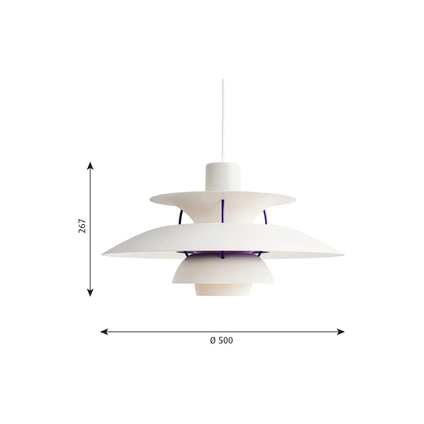 PH 5 pendel i matlakeret aluminium med afblændingsring samt stag i valset aluminium fra Louis Poulsen. Farve: classic hvid. Mål: H: 26,7 x Ø 50 cm. Lyskilde: 75W E27. Design: Poul Henningsen.