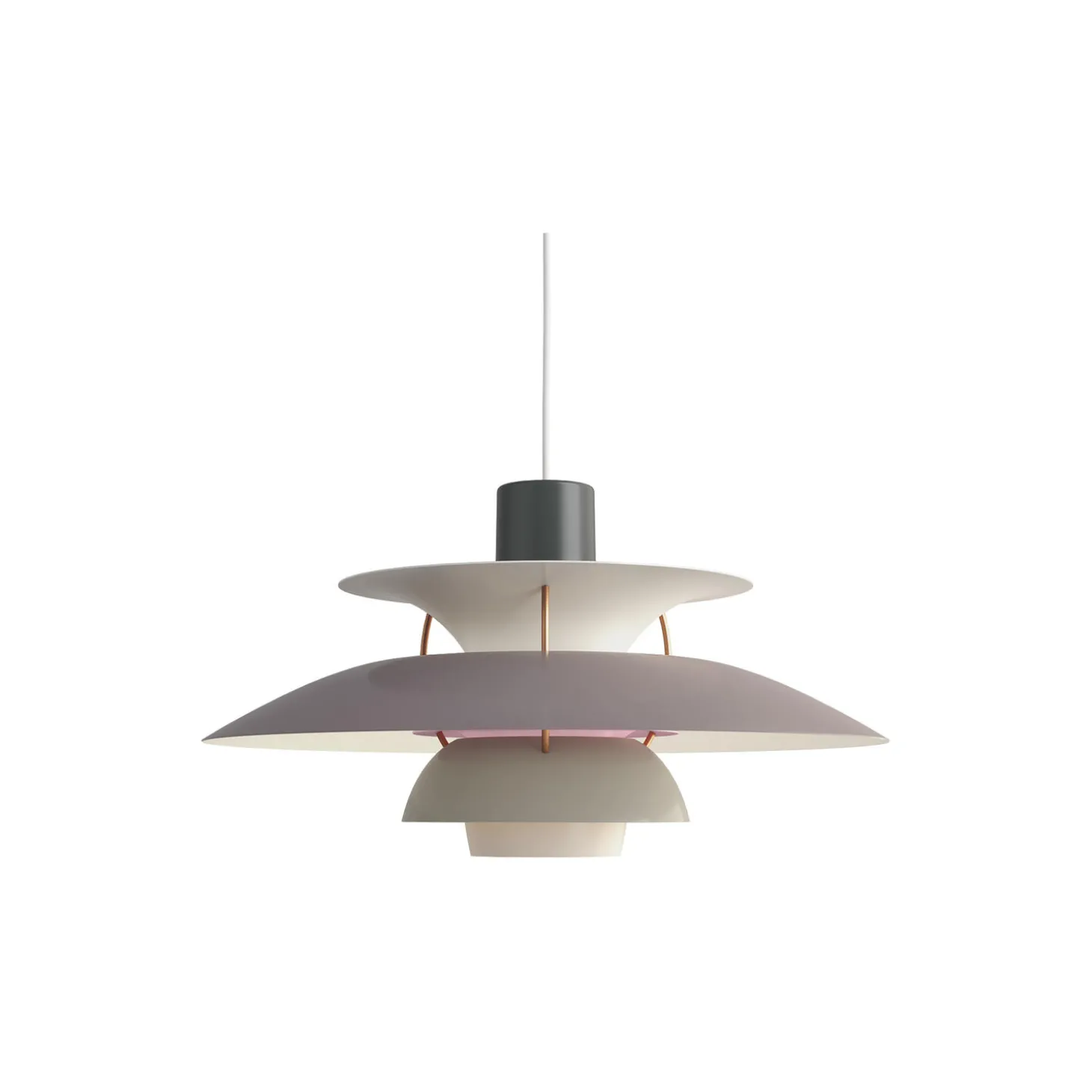PH 5 pendel i matlakeret aluminium med afblændingsring samt stag i valset aluminium fra Louis Poulsen. Farve: nuancer af grå. Mål: H: 26,7 x Ø 50 cm. Lyskilde: 75W E27. Design: Poul Henningsen.