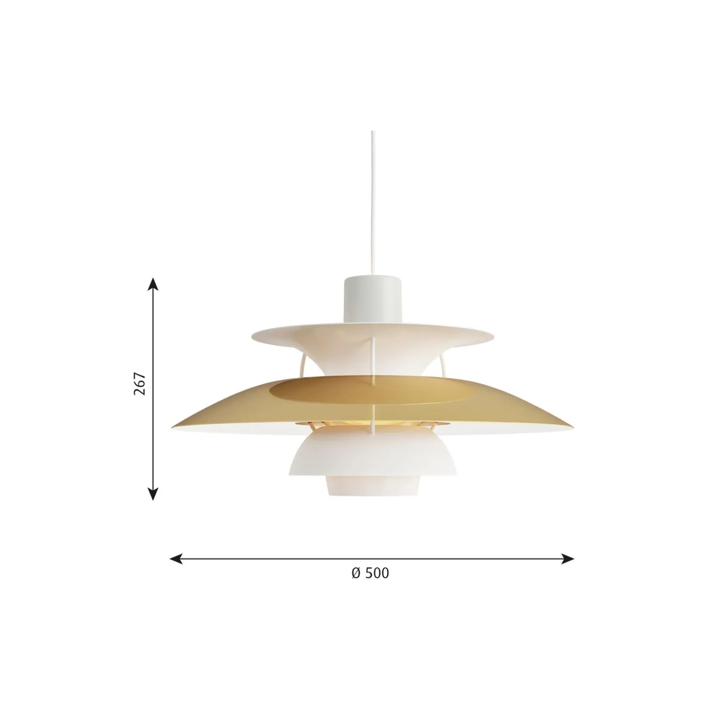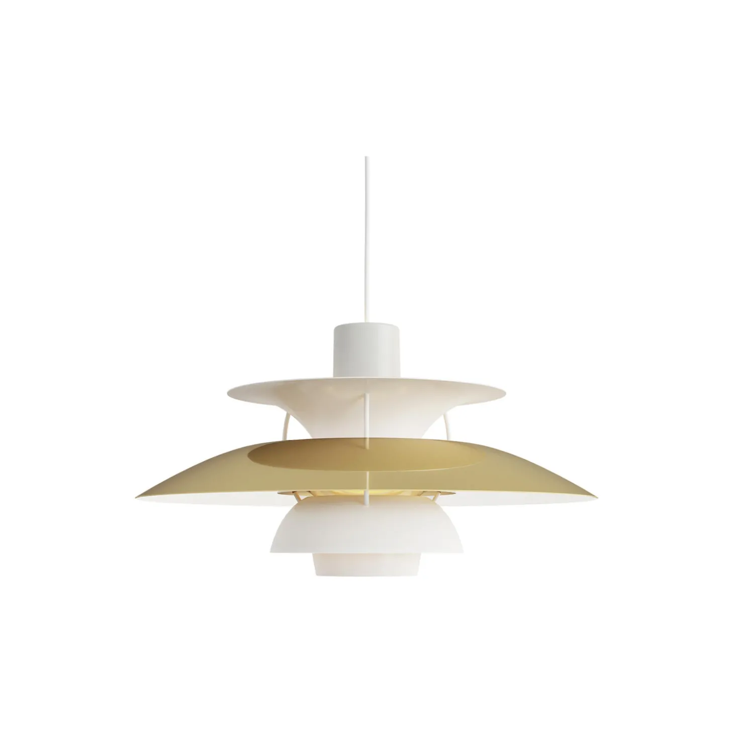 PH 5 pendel med overskærm i optrukket messing på oversiden og matlakeret aluminium på øvrige skærme samt indersiden. Afblændingsring i messing og stag i valset aluminium fra Louis Poulsen. Farve: messing. Mål: H: 26,7 x Ø 50 cm. Lyskilde: 75W E27. Design: Poul Henningsen.