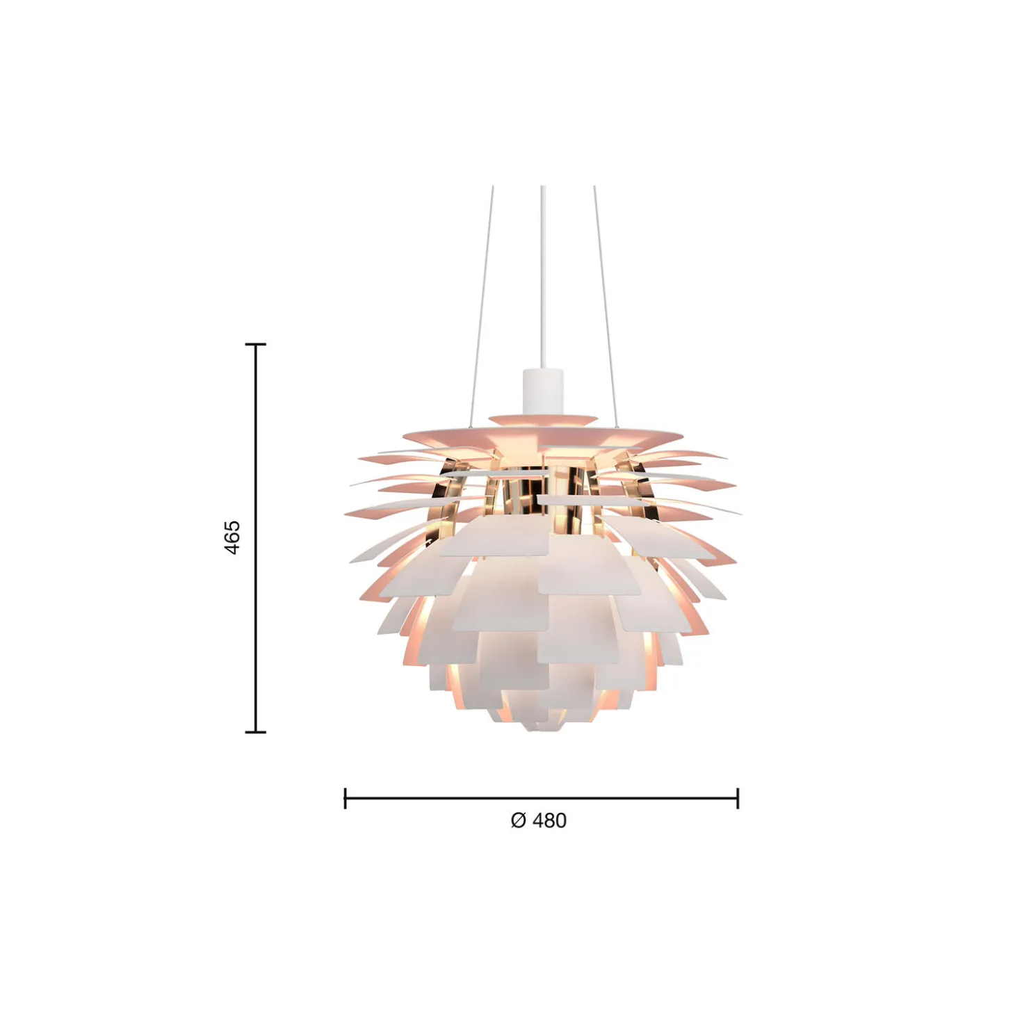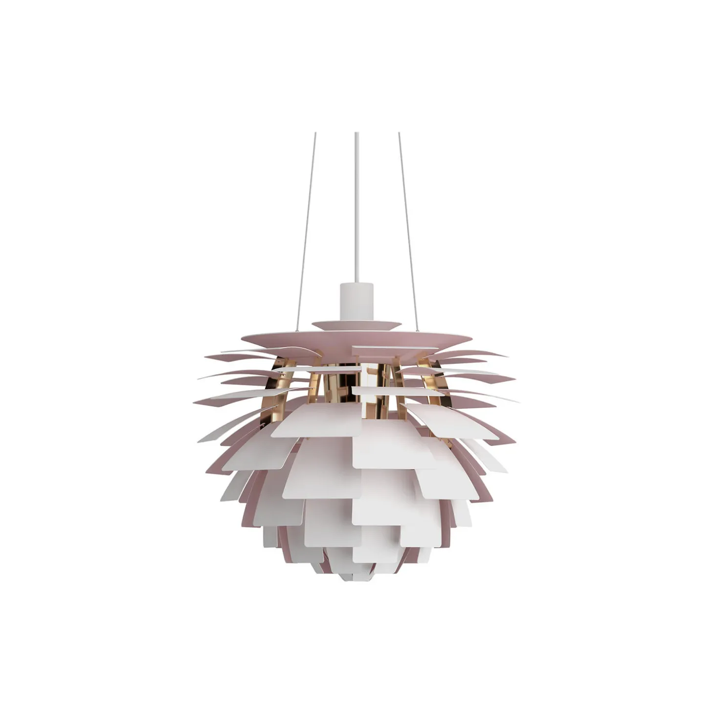 - Materiale: Blade: Laserskåret stål. Øverste skærm: Hvid yderside med lys rosa inderside, spundet stål. Ophængning: Hvid. Stel: Messing metalliseret, laserskåret stål.