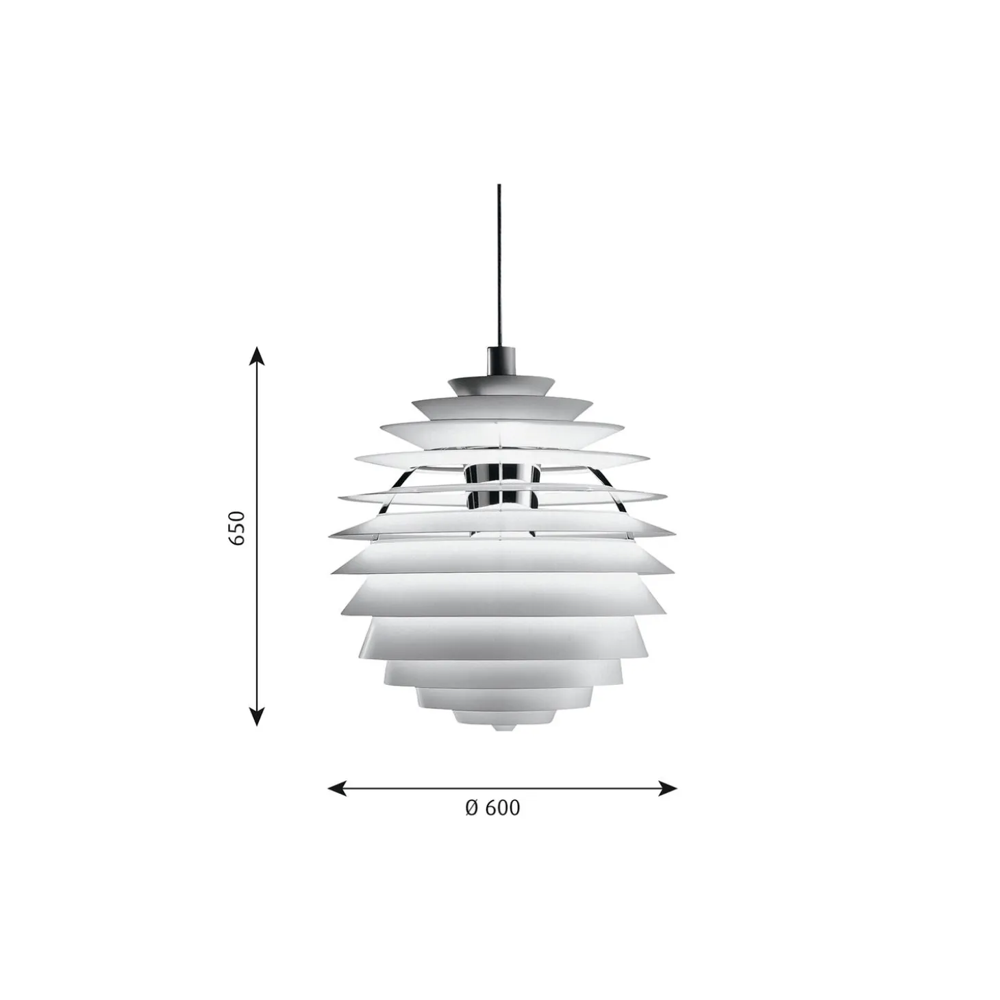 PH Louvre pendel i lakeret aluminium, blank på oversiden og mat på undersiden samt stel i højglansforkromet aluminium fra Louis Poulsen. Farve: hvid. Mål: H: 65 x Ø 60 cm. Lyskilde: LED 2700K 96W. Design: Poul Henningsen.