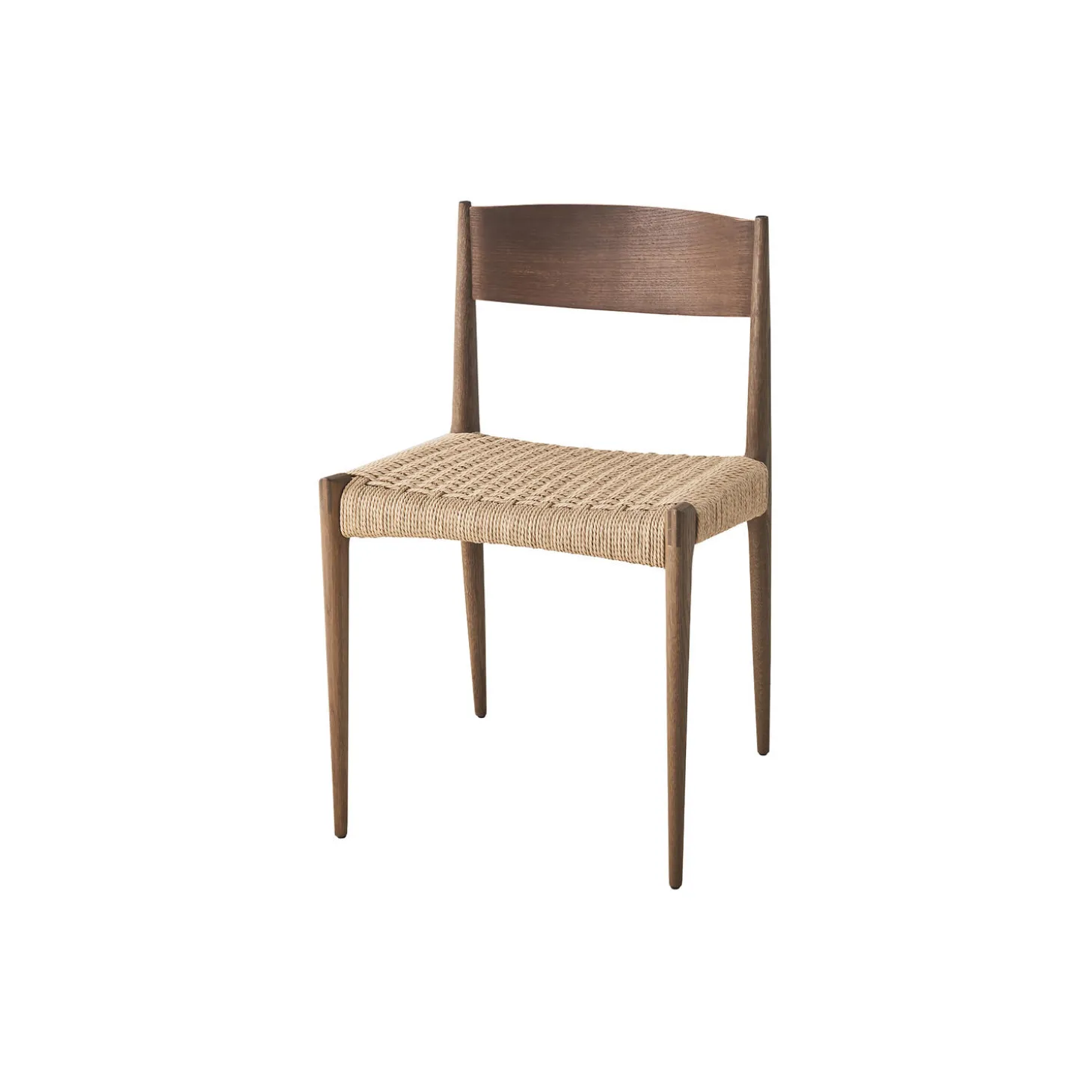 Pia spisebordsstol i røget eg med sæde i papirgarn fra DK3. Farve: røget eg/natur. Mål: H: 75 x B: 48 x D: 49 cm. Siddehøjde: 45 cm. Design: Poul Cadovius.