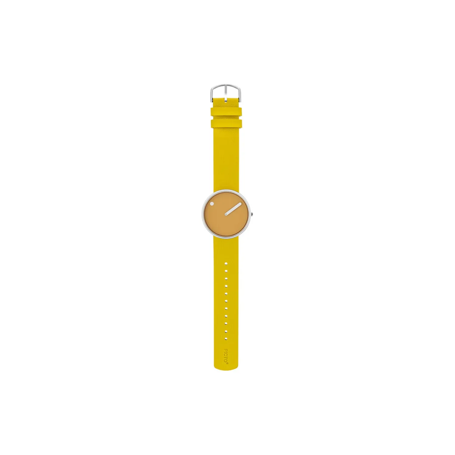 Urets diameter: 40 mm. Skivefarve: mustard yellow. Urkassefarve: polished steel. Remtype: leather strap. Rembredde: 20 mm. Remfarve: canary yellow. Urværk: MIYOTA 2025.