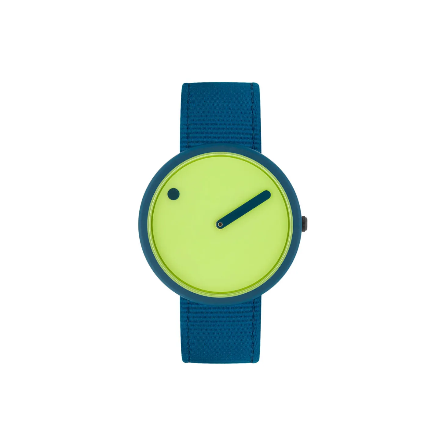 PICTO wrist watch with a rotating dial and deep blue recycled plastic strap. The dial on this watch is 40 mm.