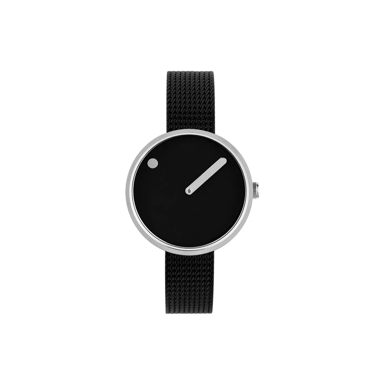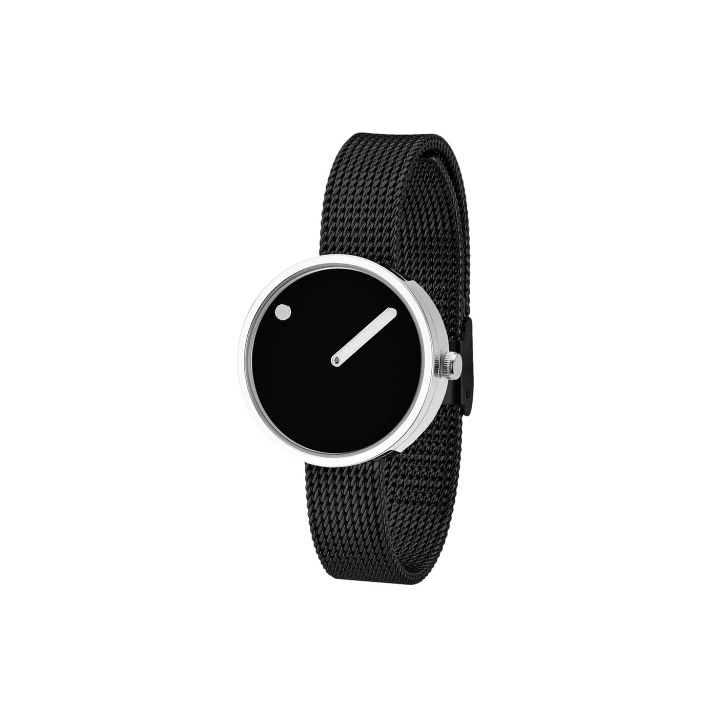 Urets diameter: 30 mm. Skivefarve: black. Urkassefarve: polished steel. Remtype: mesh band. Rembredde: 12 mm. Remfarve: matt black. Urværk: MIYOTA 2025.