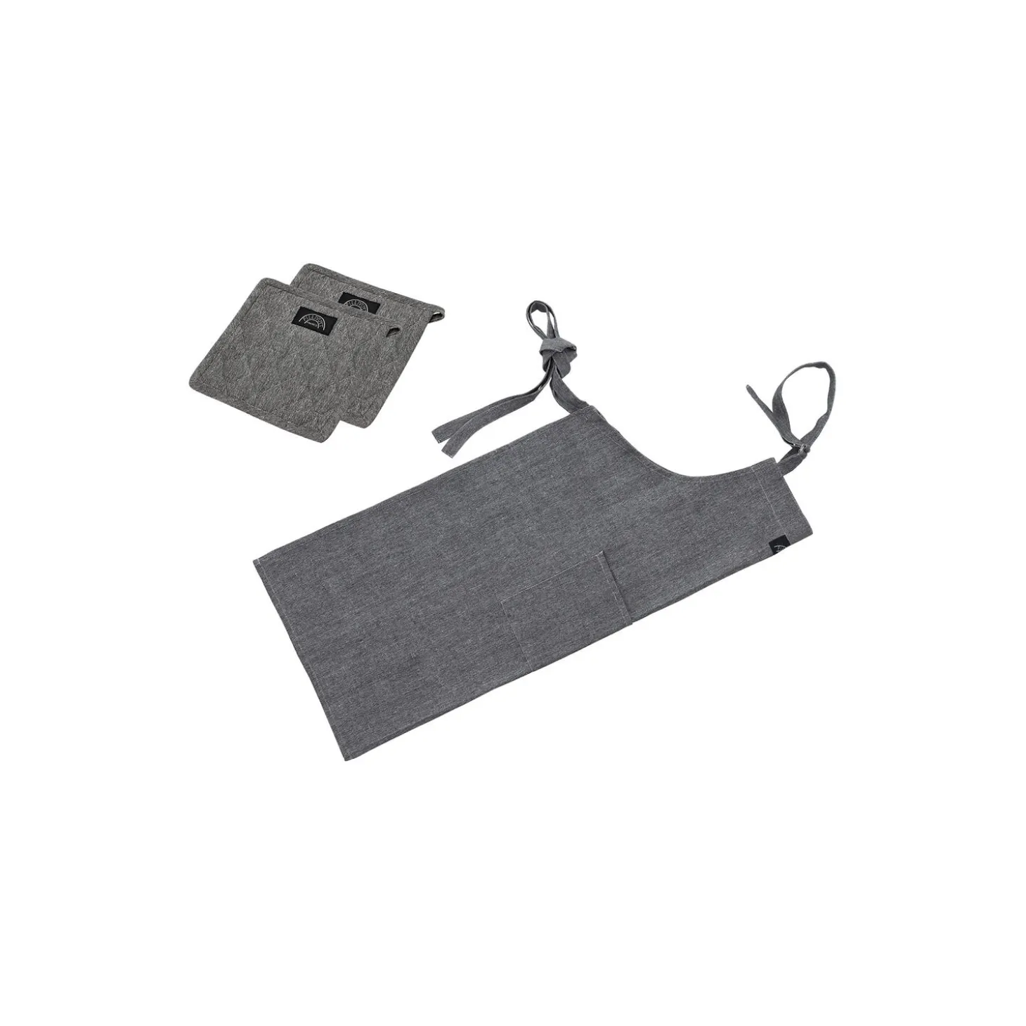 Tekstilsættet består af forklæde 95 x 80 cm og 2 grydelapper 22,5 x 22,5 cm i bomuld/polyester.Tekstilerne er fremstillet af genanvendte stofrester, der ellers ville være blevet kasseret. Stofresterne sorteres efter farve, trevles til tekstilfibre og bliver derefter spundet og vævet igen. Derfor kan der være nuanceforskelle fra parti til parti.