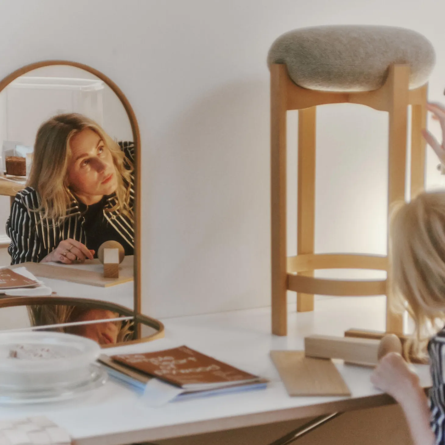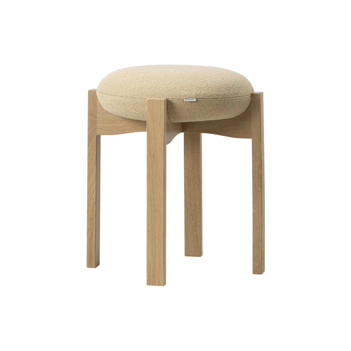 De fire lodrette ben på træstellet er samlet i en krydskomposition med elegante fordybninger, hvor den lette, polstrede sædehynde er placeret ovenpå. I kontrast hertil fuldender den detaljerede fordybning på undersiden det kunstneriske helhedsindtryk. Pioneer Stool’s enkle, unikke og karakteristiske kombination af former og materialer er et moderne bud på skandinavisk design, der kombinerer funktionalitet med Bruuns genkendelige skulpturelle minimalisme.