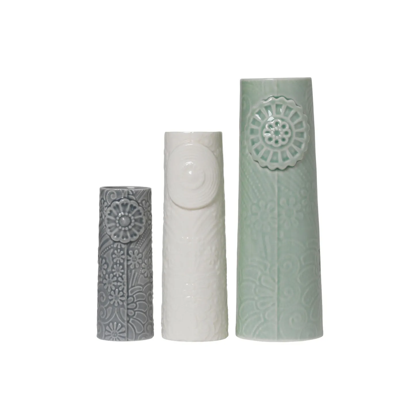 Sampak med tre vaser i farvekombinationer, der komplimenterer hinanden godt. Indeholder: Pipanella Micro Flower Blue Grey, Pipanella Mini Flower White & Pipanella Small Flower Celadon.