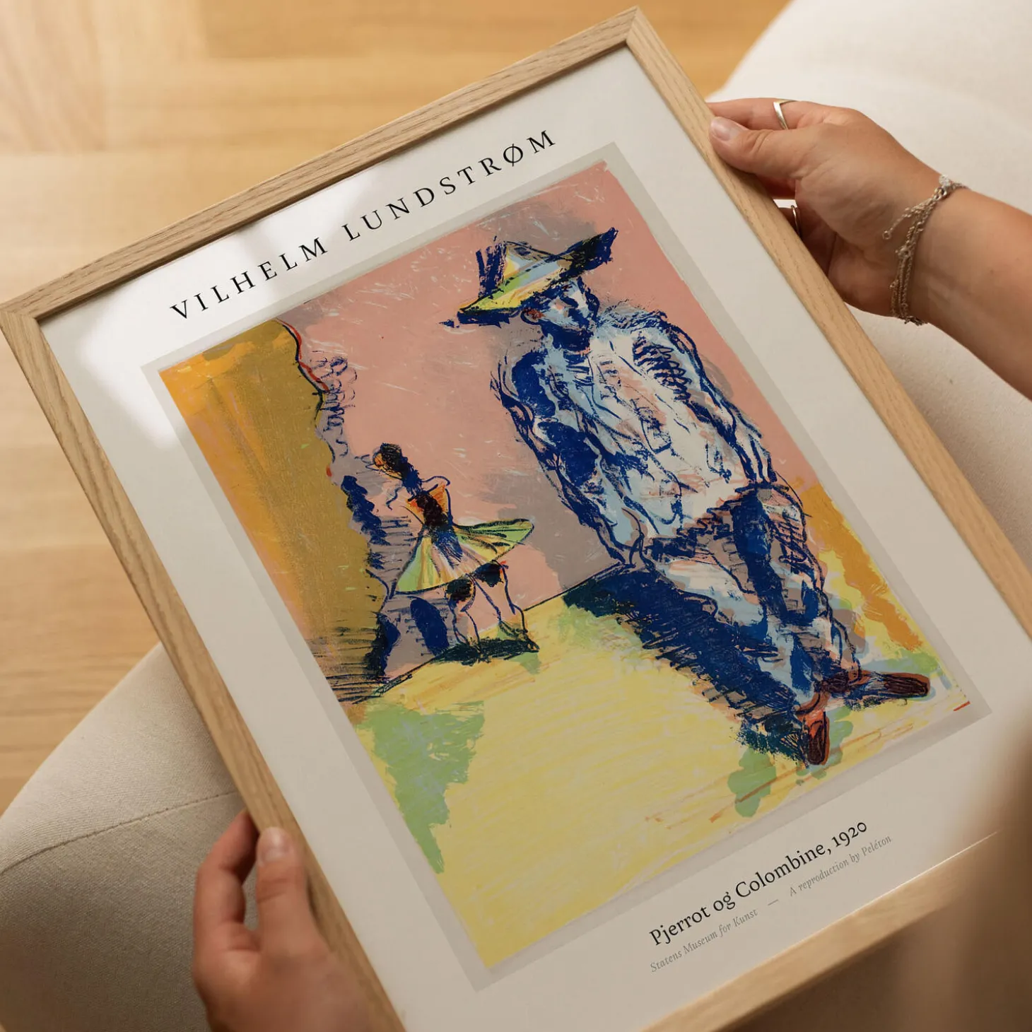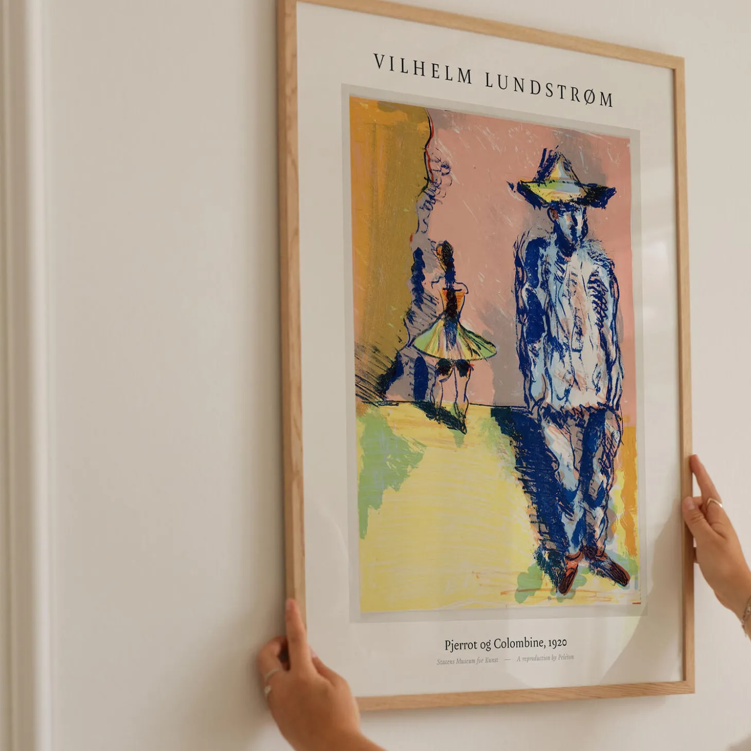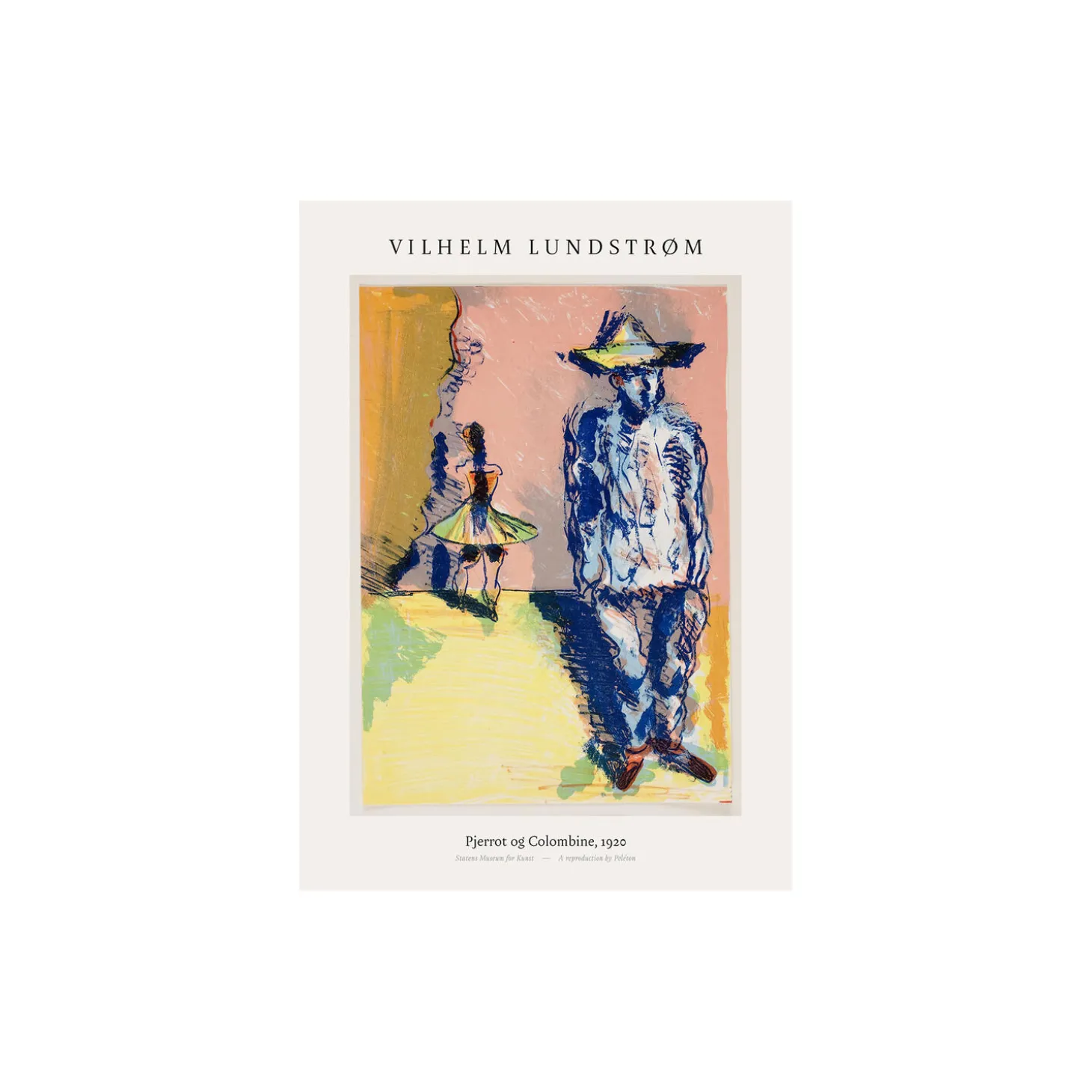 Kunstplakaten: “Pjerrot og Colombine” af kunstneren Vilhelm Lundstrøm er en malet plakat, der er genskabt af Peléton. Denne plakat serie med Vilhelm Lundstrøms eksperimenterende og geometriske kunstplakater, er karakteriseret ved hans farverige men simple stil.