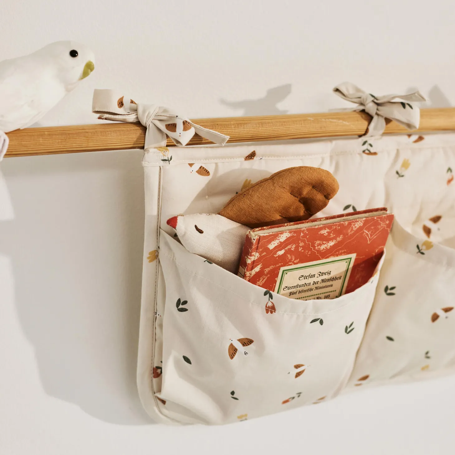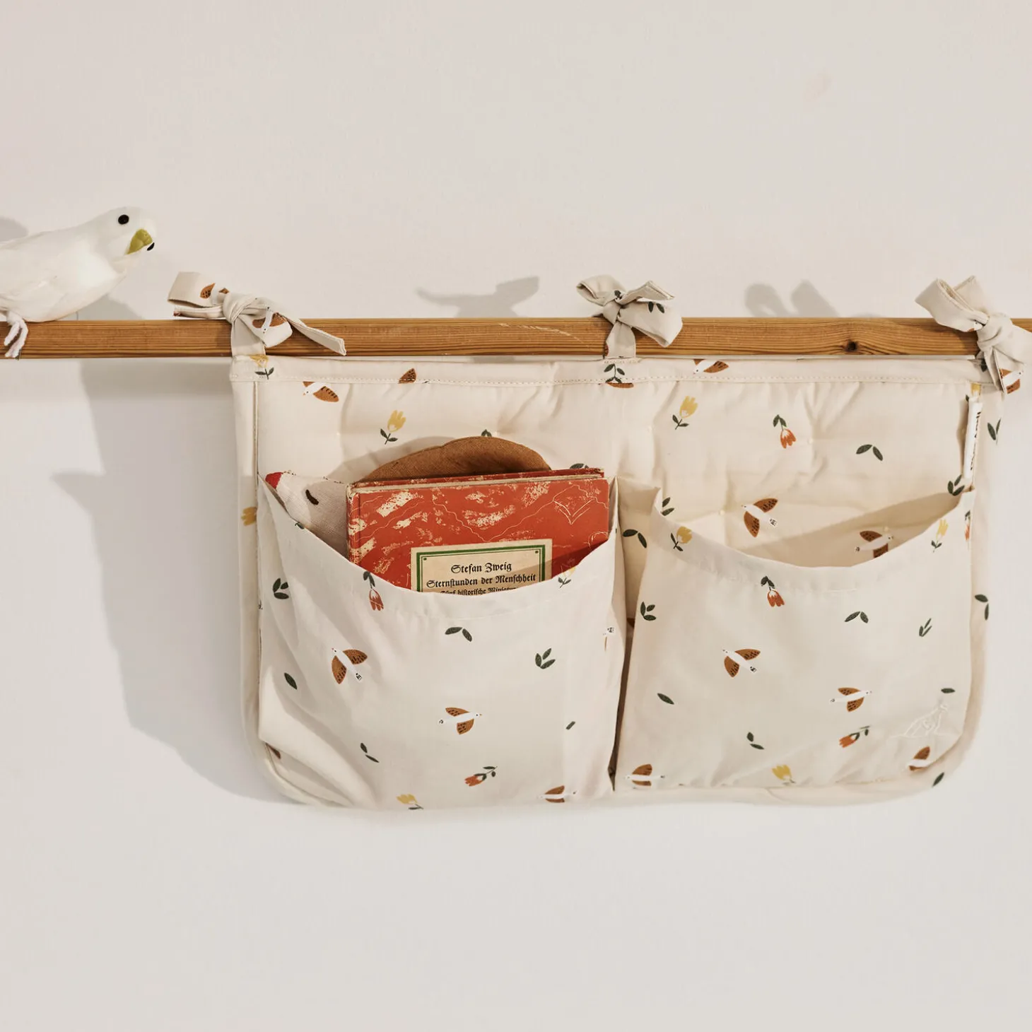 Vores skønne quiltede sengelomme er dekorativ og praktisk til opbevaring af yndlingsbamsen, den lille bog eller sutterne. Fastgøres nemt til sengen med fine bindebånd.