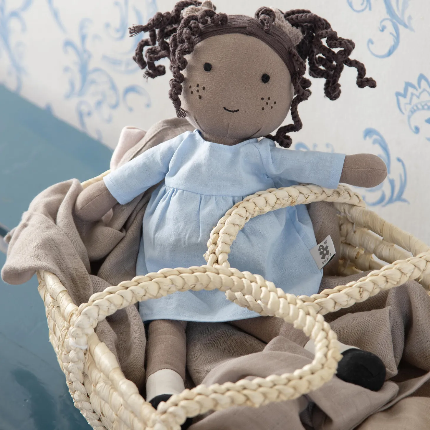 Poppy er en blød stofdukke, der vil vinde dit barns hjerte på ingen tid. Hendes krop og kjole er fremstillet af bomuld og hør, og hendes fine mørke hår er hæklet. Poppy måler 43 cm i længden og er fyldt med blødt genanvendt polyester.