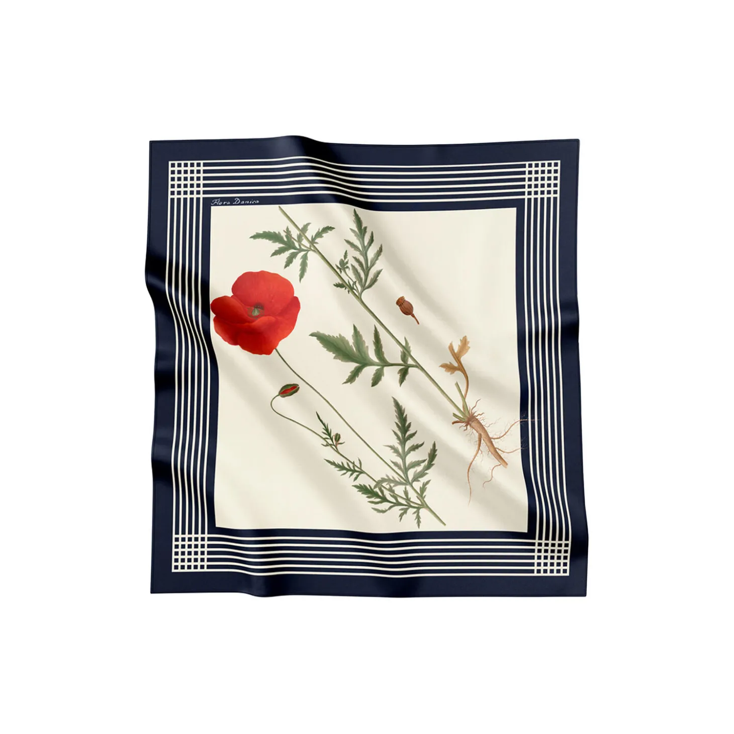 Poppy in White er et lille kvadratisk blomstrede tørklæde, med motiv af Flora Danica’s illustration af valmuen. Printet består af hele den originale valmue-illustration der pryder midten af tørklædet, det bliver omkranset af sorte og hvide striber i kanterne af tørklædet. Det blomstrede tørklæde har et klassisk og feminint look og er lavet i den fineste silke satin. Tørklædet kan kan styles på mange forskellige måder, eksempelvis rundt om halsen, i håret eller på tasken.