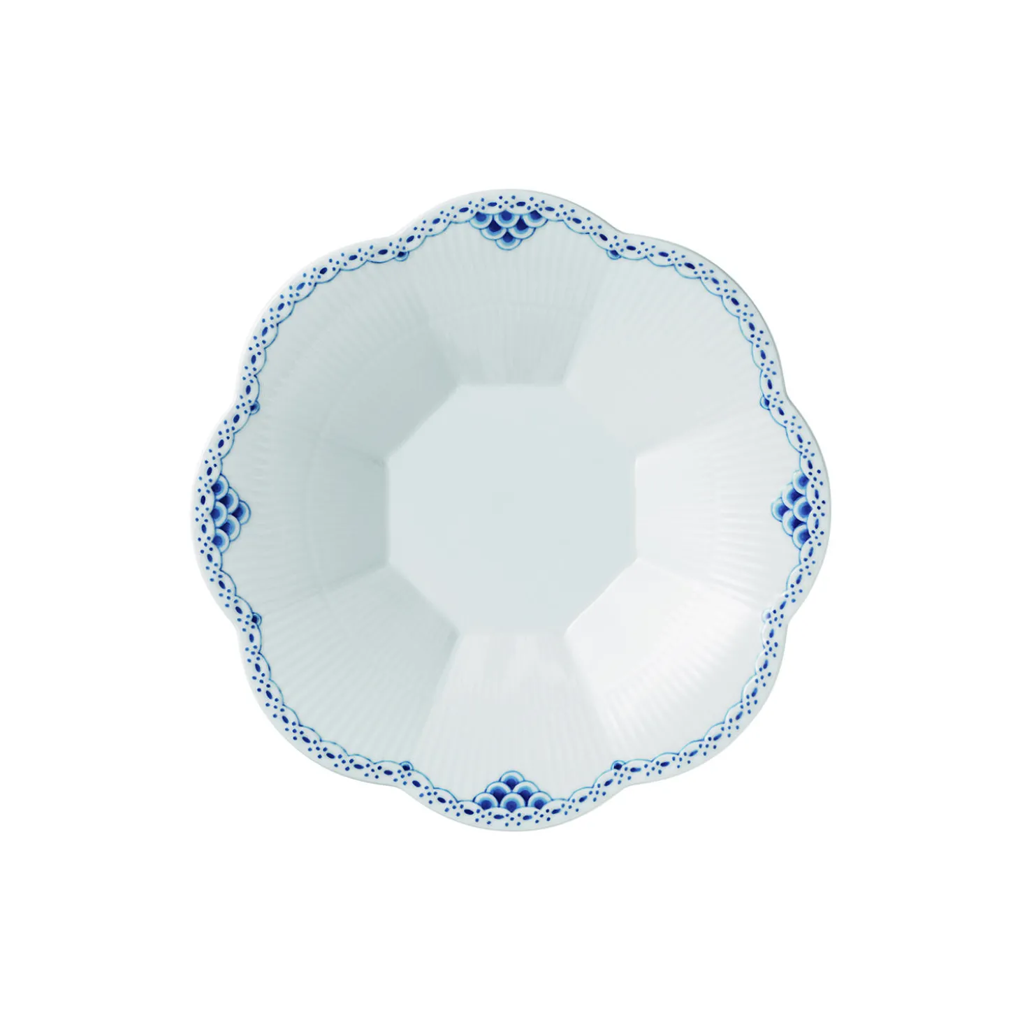 Prinsesse kantet skål i porcelæn fra Royal Copenhagen. Denne romantiske Skål fra Prinsesse-stellet har otte kanter, der som kronblade åbner sig op og afslører skålens håndmalede blondebort og fiskeskælsdekorationer. Med sit organiske formsprog er porcelænsskålen på 25,5 cm et smukt element i ethvert rum i hjemmet.