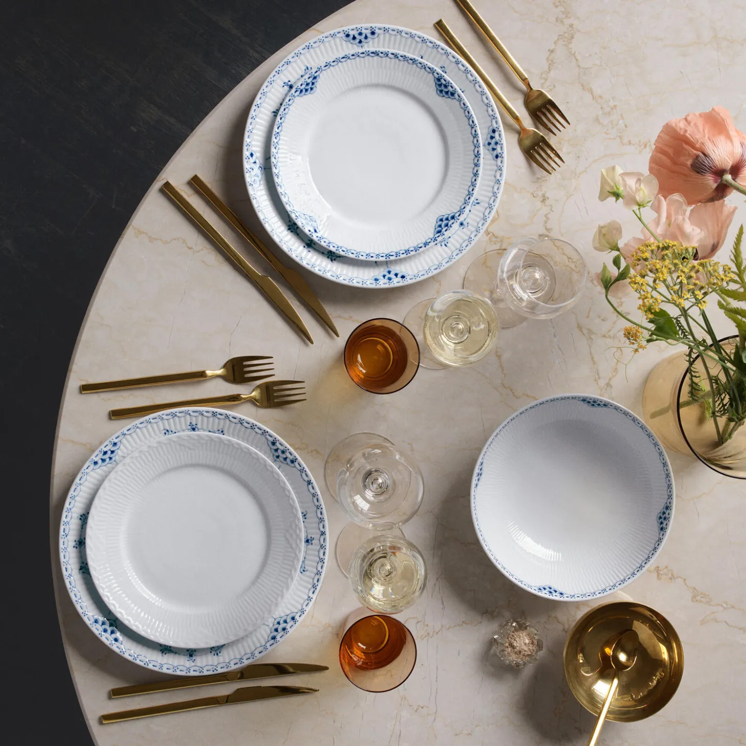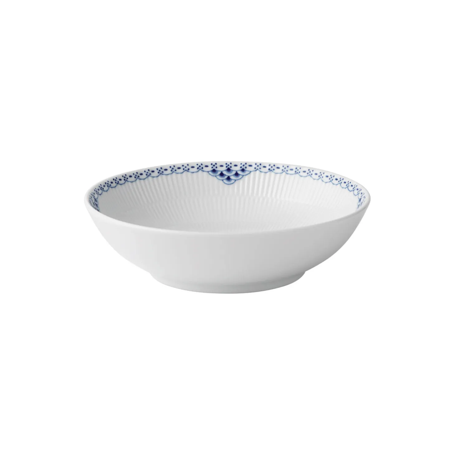 Prinsesse skål i porcelæn fra Royal Copenhagen. Denne enkle skål på 110 cl fra Prinsesse-stellet er håndmalet med stellets klassiske blondekant, der elegant snor sig langs skålens kant, hvor den mødes af fine, håndlavede rifler. Porcelænsskålen kan være udgangspunktet for en romantisk borddækning, og den er også nyttig som en dyb tallerken.