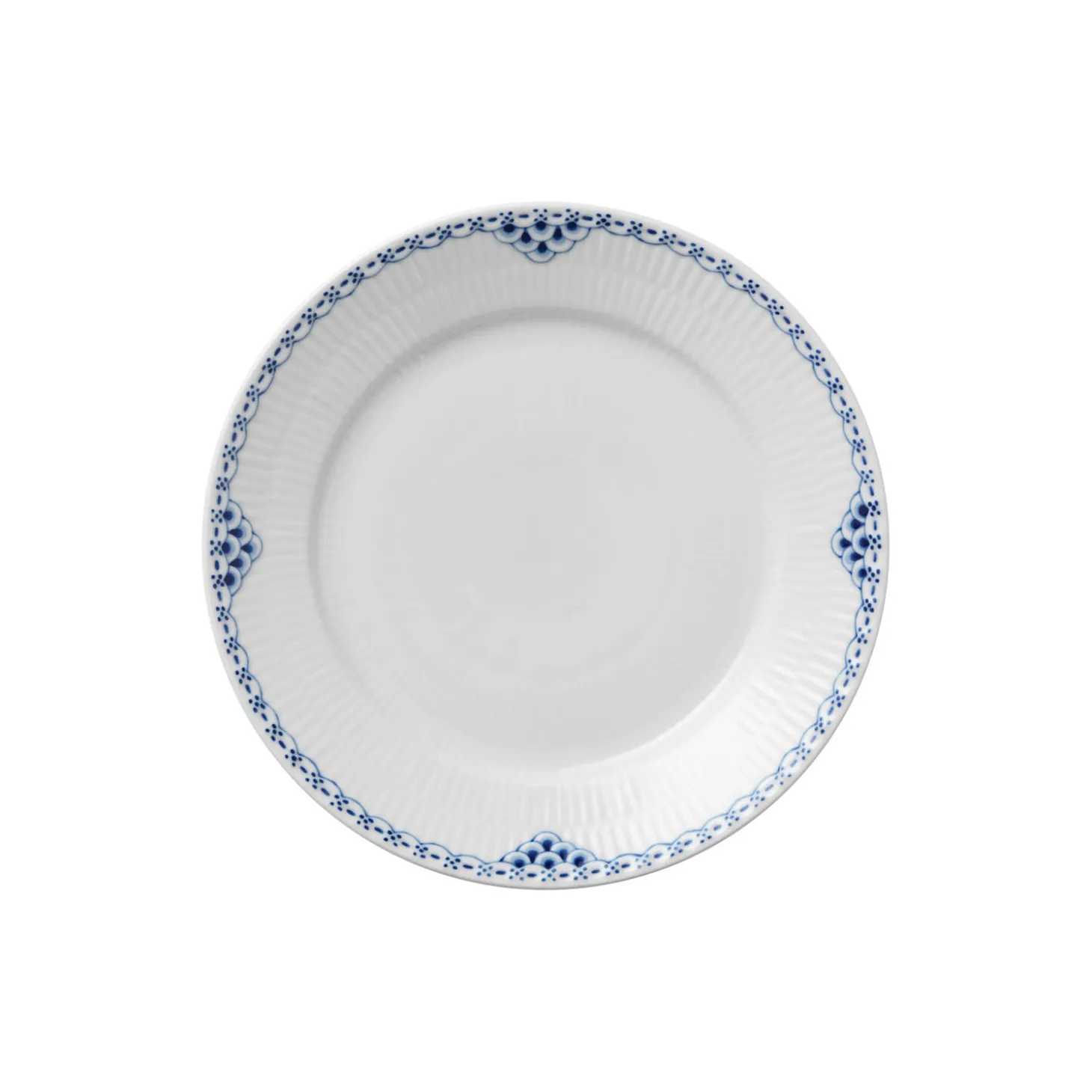 Prinsesse frokosttallerken i porcelæn fra Royal Copenhagen. Med sin størrelse på 22 cm er denne Prinsesse-tallerken en oplagt frokosttallerken. Ved berøring af den håndmalede, blå blonde synes hvert eneste penselstrøg at være broderet i porcelænet og sammen med de smukke rifler tilfører tallerkenen et strejf af klassisk skønhed til ethvert bord.