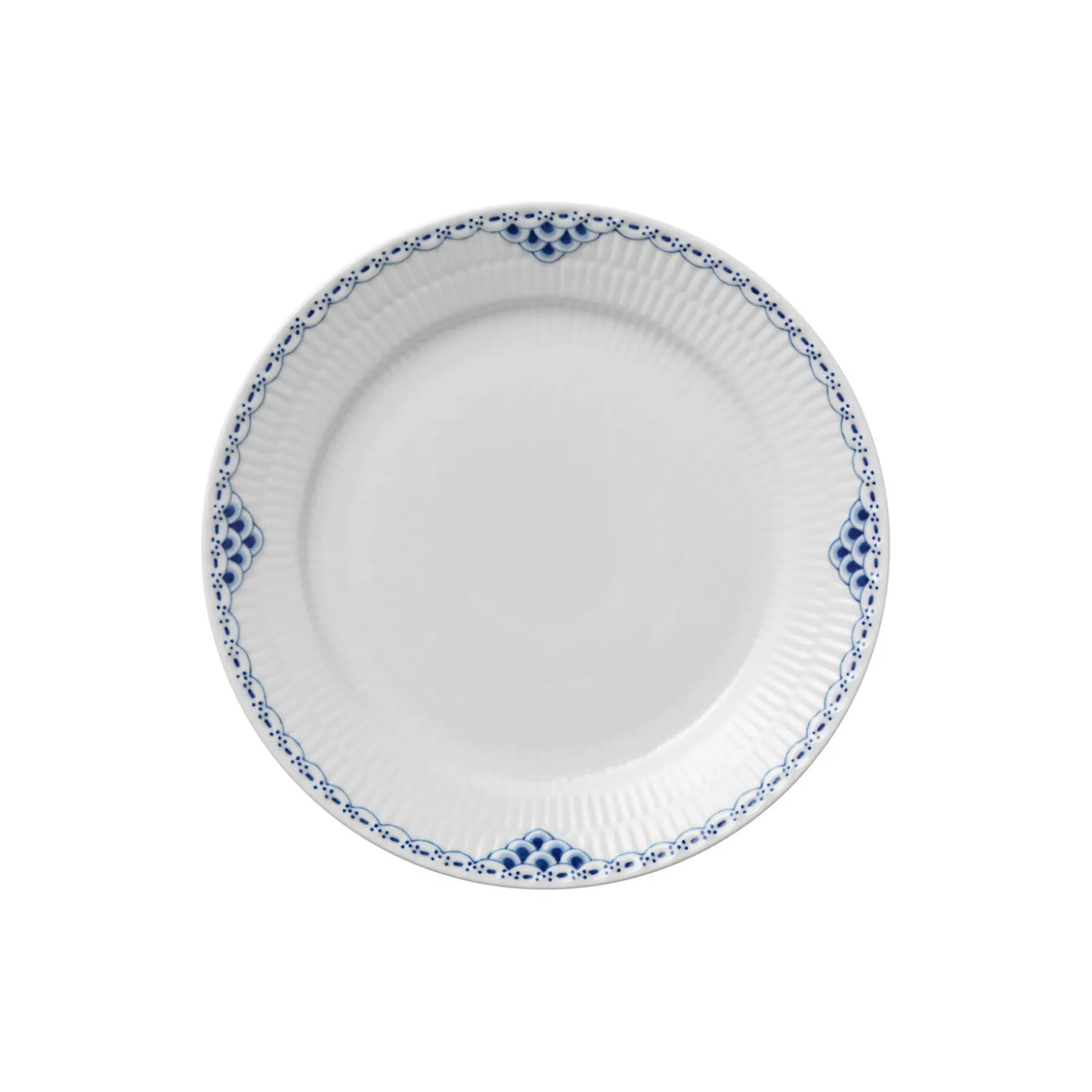 Prinsesse middagstallerken i porcelæn fra Royal Copenhagen. Denne smukke Tallerken på 25 cm fra Prinsesse-stellet er ideel som middagstallerken eller en stor frokosttallerken. Porcelænstallerkenens håndmalede blondekant skaber en smuk elegance, der komplimenteres af små fiskeskælsdekorationer og taktile rifler.