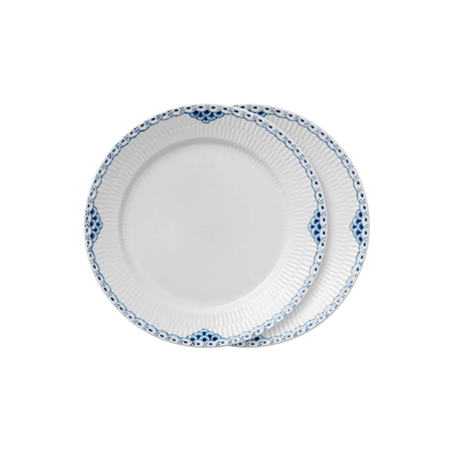 Dette smukke sæt af to Prinsesse Tallerkener er en evigt tidløs tilføjelse til, eller begyndelse på, en Royal Copenhagen samling. Tallerkenerne på 27 cm prydes af en håndmalet blonde, som giver et feminint udtryk i enhver borddækning. Tallerkenerne er nyttige som middagstallerkener eller serveringsfade. Den feminine blonde og de blå fiskeskælsdekorationer på Prinsesse-stellet afslører et tæt bånd til de musselmalede stel, men alligevel er det feminine stel helt sit eget. Det delikate, klassiske udtryk i stellet kan ubesværet sættes sammen med andre af Royal Copenhagens stel og skabe personlige og nye udtryk.