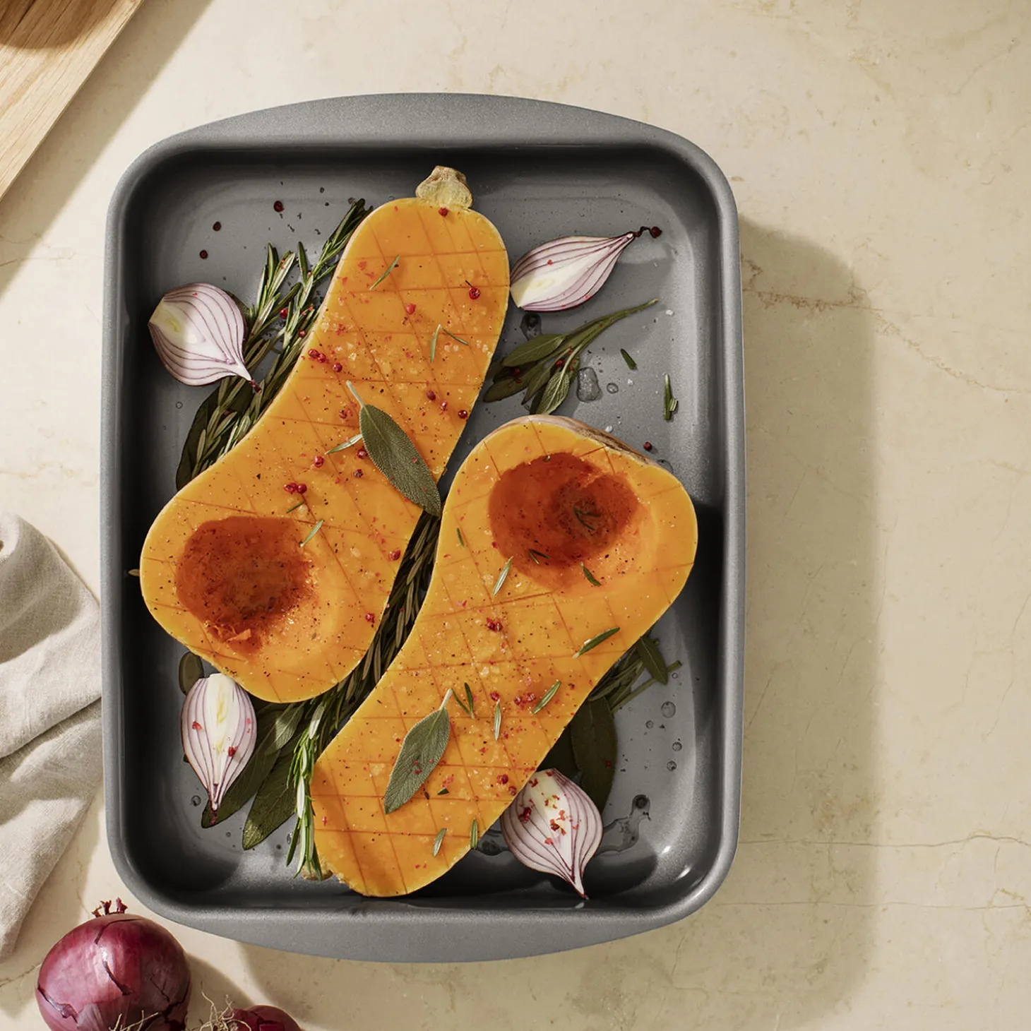 Uanset om I tilbereder grøntsager, steger grillkylling eller bager fisk leverer vores professionelle bradepande det perfekte resultat. Den slidstærke keramiske Slip-let®belægning (helt uden flourstoffer) sikrer, at maden slipper hurtigt og nemt, tåler op til 400 grader og gør rengøringen legende let. Den medfølgende stegerist sørger for, at kød og fjerkræ ligger plant og hævet over bunden. Når maden er færdig, sætter I bare fadet i opvaskemaskinen.