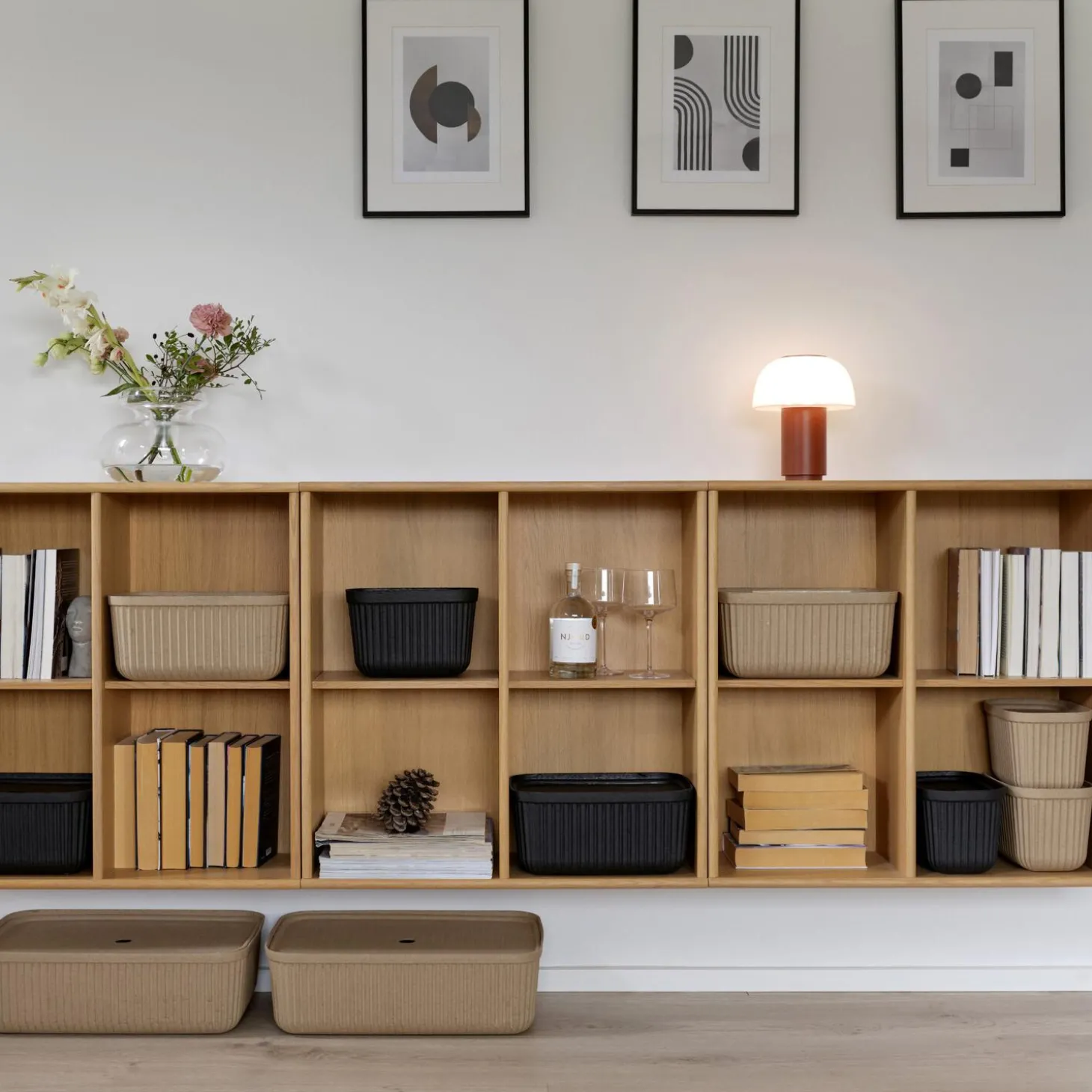 Pulp opbevaringsbokse er lavet af papirrester og rester af sukkerrør. En serie stabelbare bokse, der på én gang udtrykker æstetisk nostalgi og rå nytænkning. Det rillede mønster på siden er med til at sikre styrke og stabilitet. Pulp er et både praktisk og dekorativt element på hylderne i stuen, kontoret, entreen eller dit walk-in closet. Og i øvrigt en glimrende gaveide til den miljøbevidste æstetiker.Pulp-serien er lavet af 100 % genanvendt materiale og er 100 % nedbrydelig. Varianten Natural Brown er fremstillet af FSC-certificeret genbrugspapir og pap, mens Black er fremstillet af overskudsmasse fra træ- og sukkerproduktion.Design: Hans Thyge Designstudio.