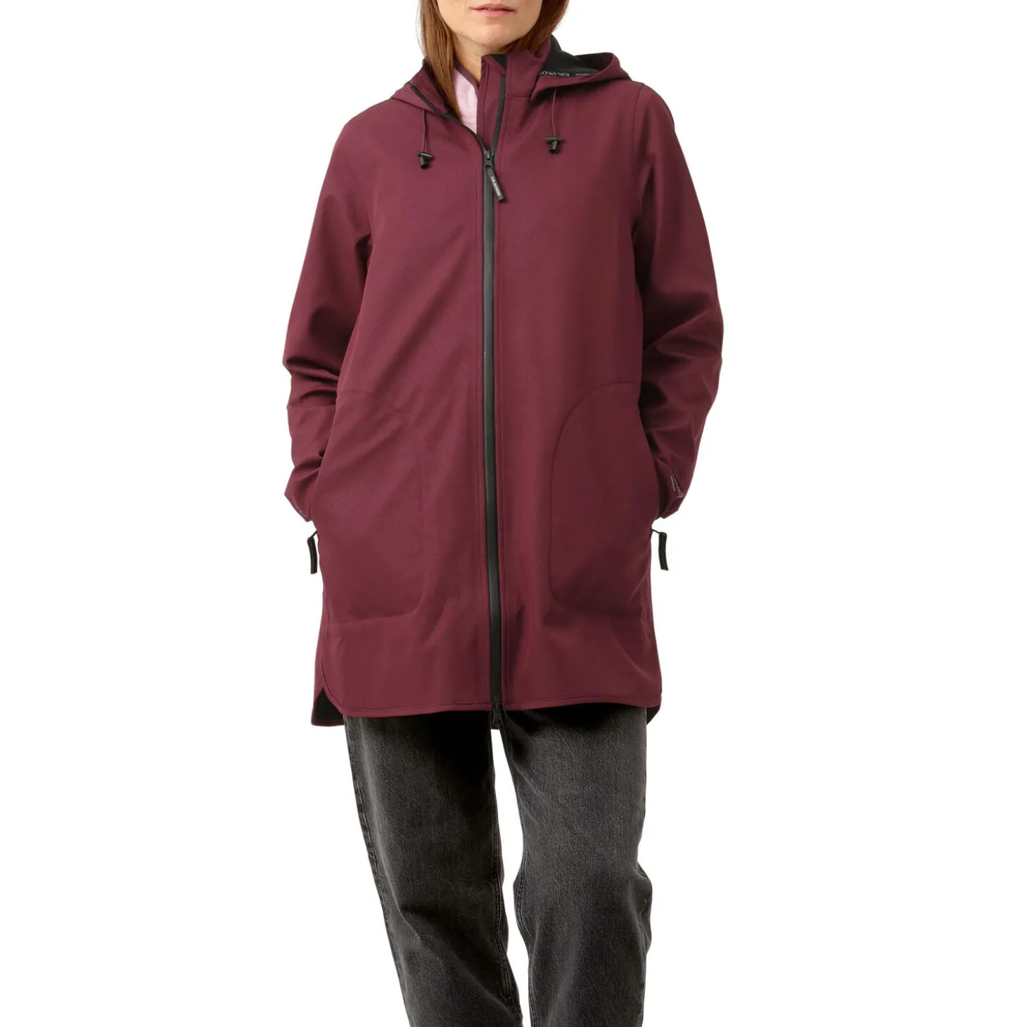 A short A-line softshell raincoat. This style is made in a breathable and fleece bonded shell fabric, adding unique comfort and warmth. The style features a detachable hood, functional front pockets, slits in side seams with press buttons and adjustable button closure at sleeve hem. The fabric surface is treated with certified Ecorepel® dirt and water repellent coating that ensures longevity. This raincoat is fully taped and has a waterproof rating of 5000 mm which will be enough for medium showers while 3000 g/m2 ensures you can move quickly without feeling damp.