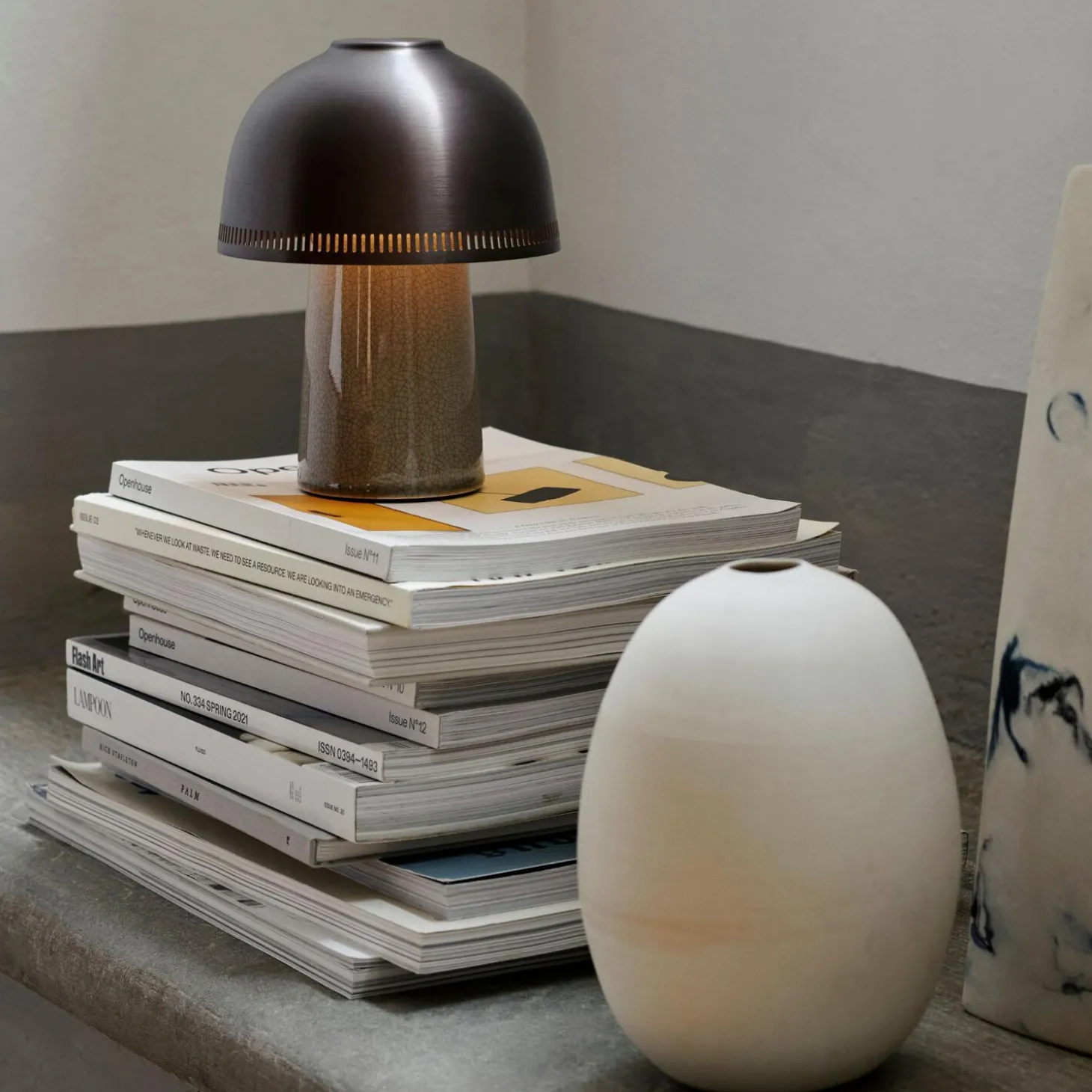 Raku SH8 transportabel bordlampe i bronzeret aluminium og keramik fra &Tradition. Farve: beige grey/bronzed. Mål: H: 21 x Ø 16 cm. Lyskilde: LED 2700K. Design: Sebastian Herkner.