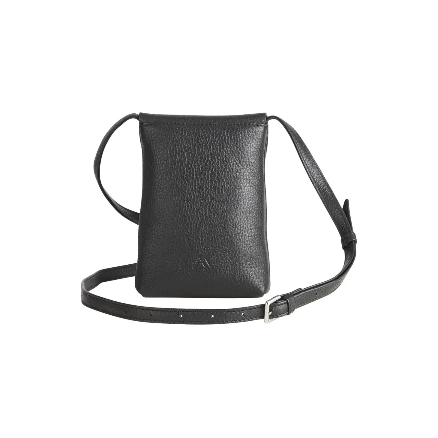 Ravea Phone Bag fra Markberg er produceret i koskind. Mobiltasken har en firkantet flap som lukkes med magnetisk lukning. Dertil har den plads til 3 kortholder. Indvendigt har den ét rum. Læderstroppen er justerbar. Taskens foer er i 100% bomuld. Mål: 11 cm x 15 cm x 3 cm