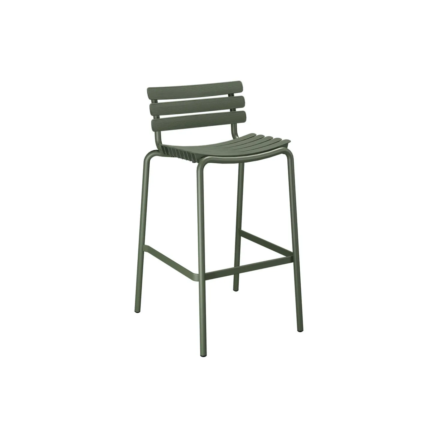 ReCLIPS barstol i pulverlakeret aluminium og plast fra HOUE. Farve: olive green. Mål: H: 99 x B: 55 x D: 56 cm. Siddehøjde: 76-79 cm. Design: Henrik Pedersen.