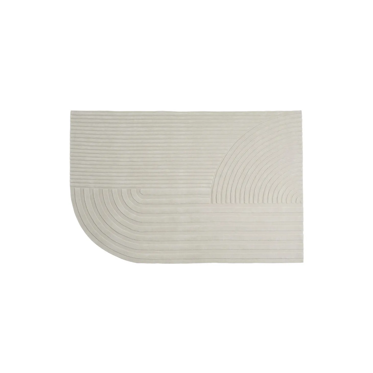 Relevo Rug fra Muuto. Relevo is a soft rug with a distinctly sculptural quality. Its striking graphic pattern is produced by trimming the tufted wool in different levels, thereby creating an eye-catching shadowplay that gives a sense of being two-tone rather than monochrome. The rug’s single rounded corner gives it a unique character, a dynamic expression in any setting. Shedding is a natural occurrence which will decrease over time. Please note that the color of the Relevo Rug may vary depending on the wool’s natural base color. Please note that all sizes of the Relevo Rug have a sizing tolerance of +/- 2%, meaning that the dimensions of the rug can differ by a maximum of 2%. Relevo does not require the use of a rug pad due to its weight.