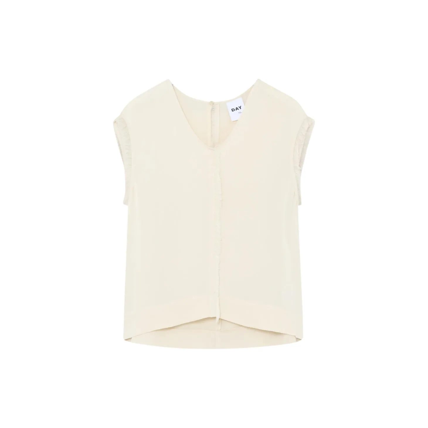 This light top features a button closure with a keyhole opening in the back, as well as fringe detailing on the front, back, and shoulders. The top has a slightly loose fit.