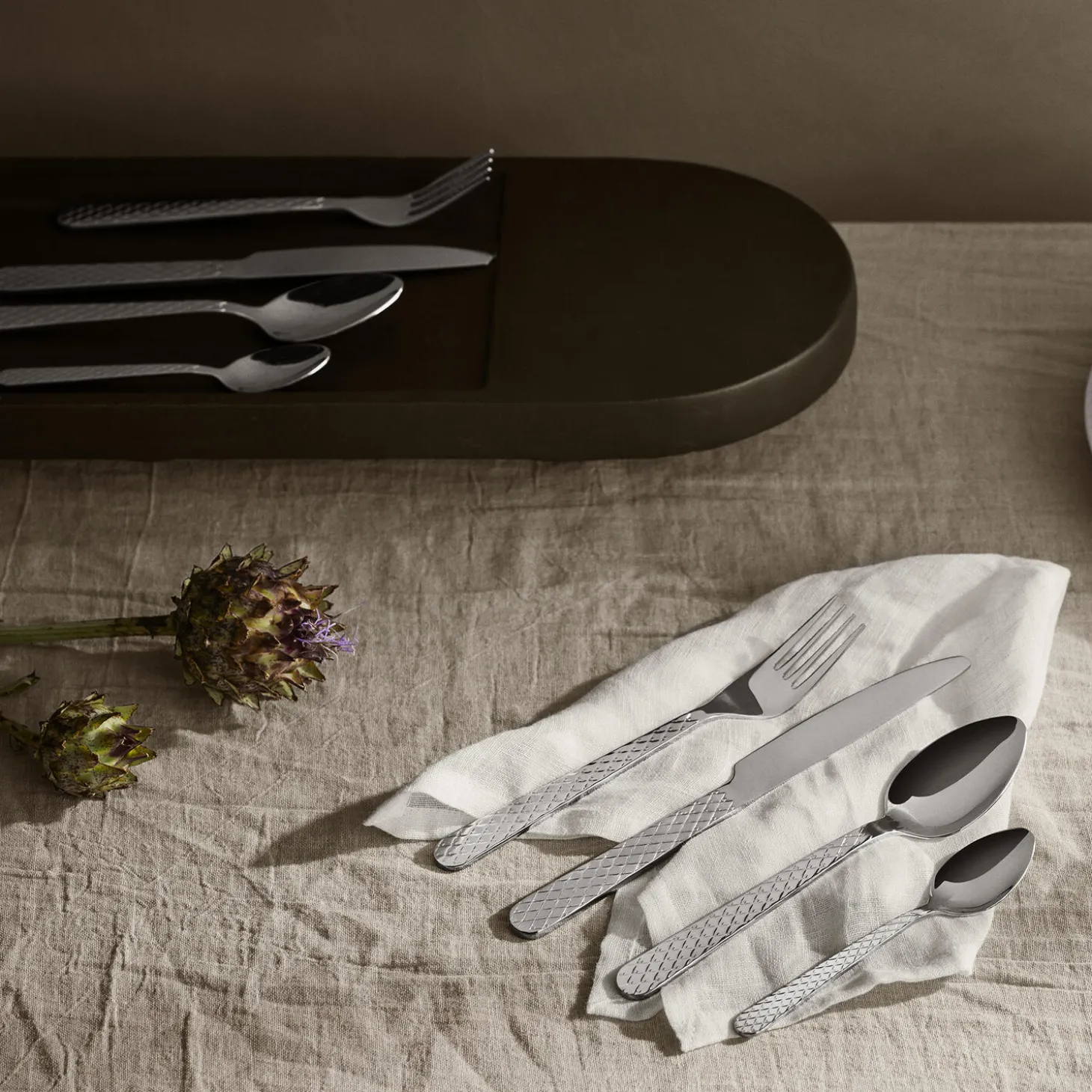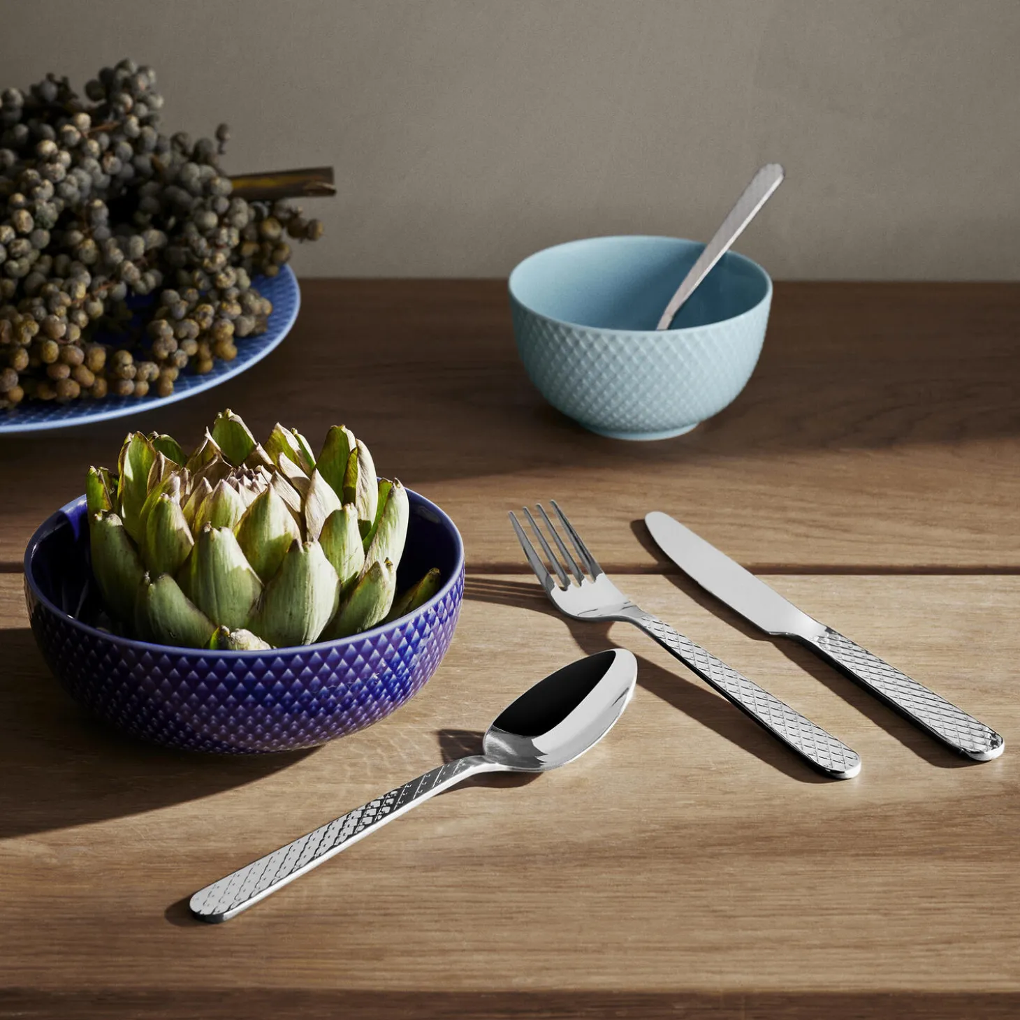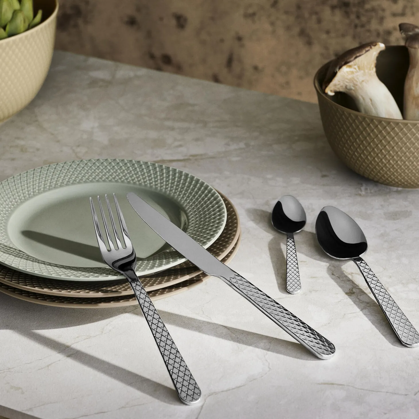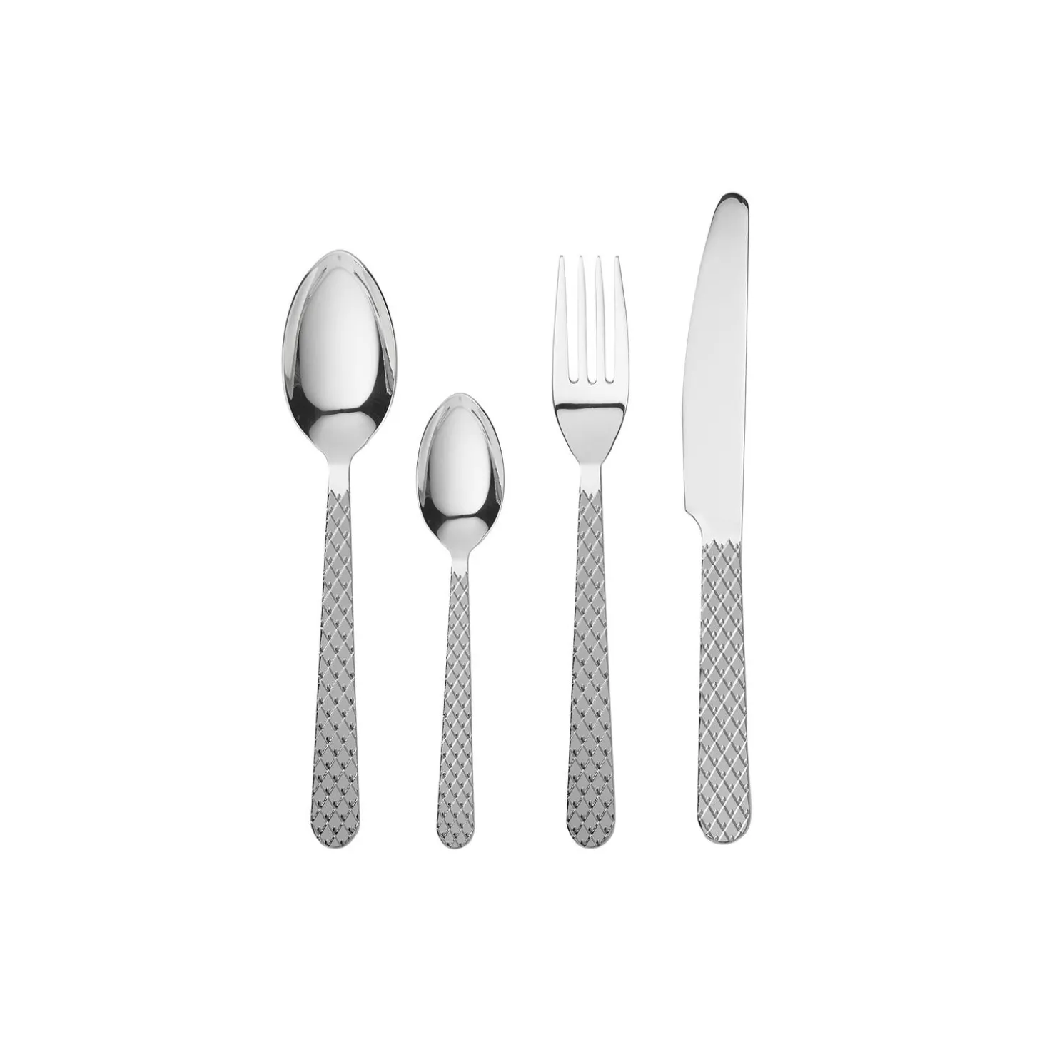 Skab samhørighed i din borddækning med den ikoniske Rhombe-signatur. Med Rhombe-bestiksættet fra Lyngby Porcelæn kan du nu få en unik helhed på tværs af alle Rhombe-serier og nyde den ekstra dybde og taktilitet, som et smukt bestiksæt i 100% genanvendt stål tilfører med sine stilrene linjer til perfektion. Hvert enkelt stykke bestik er skabt til at harmonere med detaljerne i porcelænet, så du har muligheden for at skabe præcis den følelse af luksus, der gør hvert måltid til en sublim sanseoplevelse – komponere dit eget personlige mesterværk til at fejre alle de små øjeblikke og forvandle hverdagen til noget særligt og til at gøre hver festlig sammenkomst uforglemmelig med en fuldendt stil og finesse. Kniv, gaffel, ske og teske. Fire stk. af hver. Og det velkendte grafiske Rhombe-udtryk går selvfølgelig igen på alle 16 dele i det nye bestik, hvor mønsteret ligger på skaftet og er hævet som et lavt relief, præcis som du kender det fra seriens steldele. Det er ikke kun smukt og stilfuldt, men sikrer dig også en udsøgt taktil fornemmelse i hænderne, når du holder bestikket. Du får med Rhombe-bestiksættet et strømlinet og eksklusivt design, der indbyder til, at du griber om bestikket og mærker reliefferne i hånden. Og samtidig forlænger det smukt og stilfuldt Rhombe-mønsteret ud på bordet. Den blanke finish på alle dele i bestiksættet er med til at forstærke den visuelle dybde i Rhombe-mønsteret, der med det samme fanger øjet og giver et helt unikt visuelt blikfang, du kun kan få med det originale Rhombe-design. Med en flot finish og et lille diskret logo præget i det i polerede stål matcher det både det klassiske hvide Rhombe-stel, Rhombe Earth-kollektionen og Rhombe Color-delene, og vil som noget helt nyt bidrage med at udvide hele Rhombe-seriens mange porcelænsdele med et nyt lækkert og naturligt materiale, der lader det diskrete mønster træde frem på en ny måde – og hvor kontrasten mellem det bløde formsprog og den stramme Rhombe-reflief trækker mønsterets former endnu mere tydeligt frem og skaber fokus.