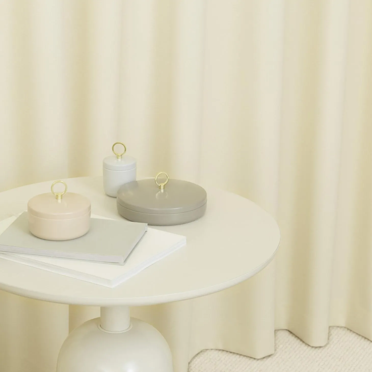 Ring er en serie af små, elegante æsker til opbevaring af personlige småejendele som smykker, skønheds-og kontorartikler. Ring boks er udført i blank, pulverlakeret stål og kommer i tre størrelser i rolige jordtoner af sand, grå og gråbrun. Lågets gyldne ring fungerer som et både funktionelt element og en dekorativ detalje.