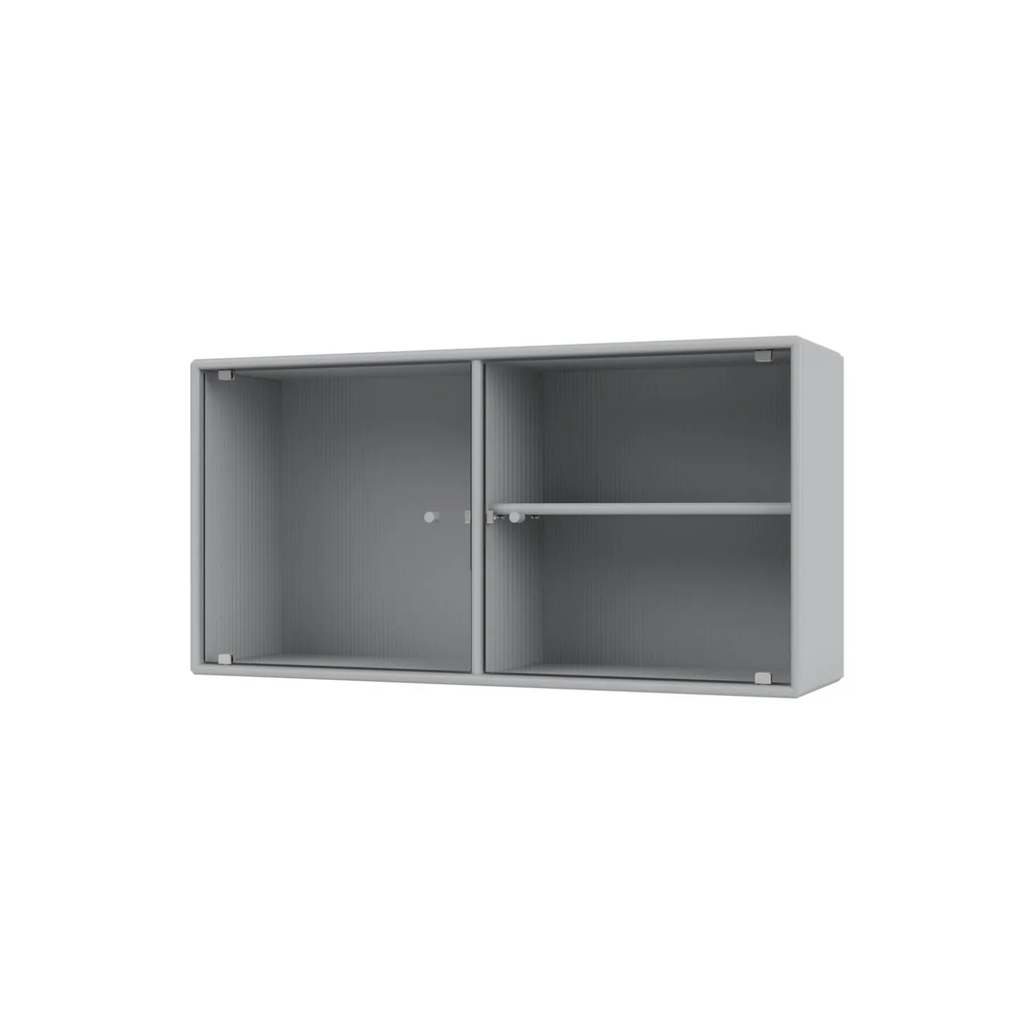 RIPPLE I er et væghængt vitrineskab med 2 låger i riflet glas. Skabet kan bruges som overskab i køkkenet, som et dekorativt skab i stuen eller spisestuen. Skabet har 1 flytbar hylde med bærere, som gør det lettere at arrangere og omarrangere hylden efter behov.