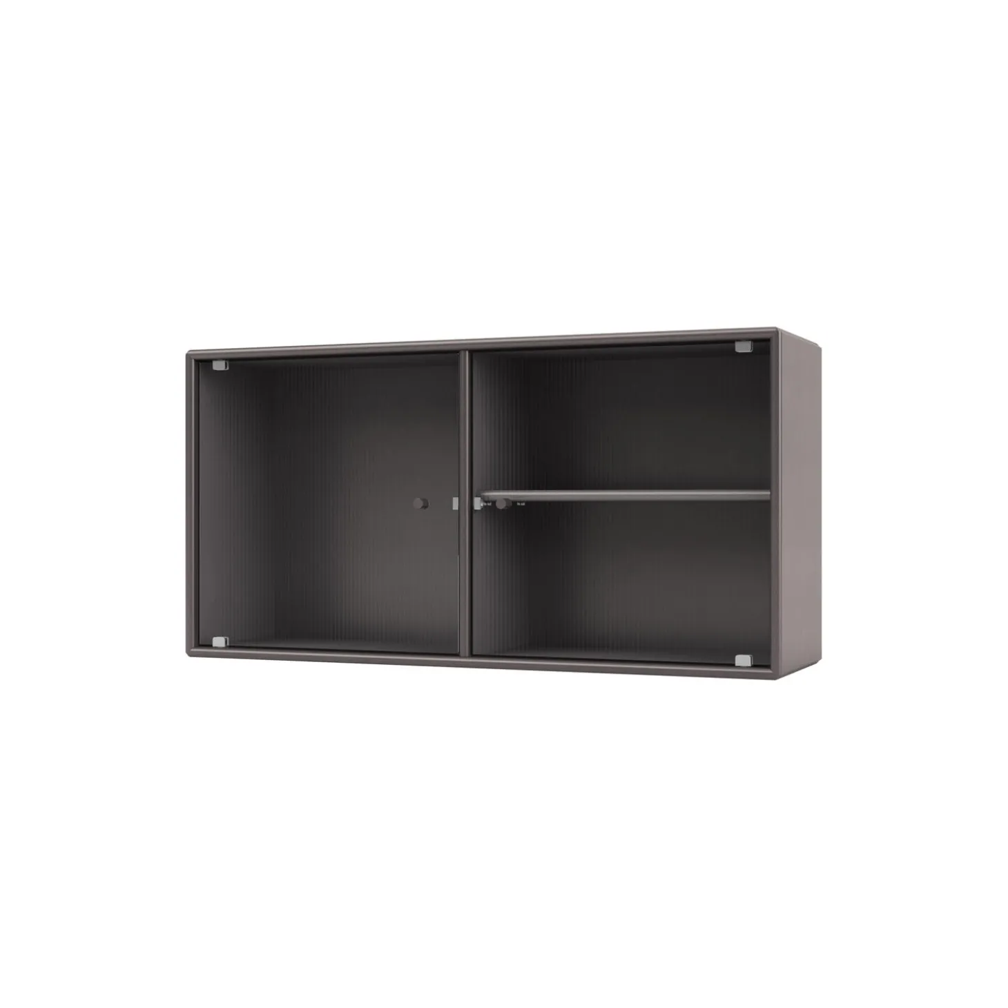 RIPPLE I er et væghængt vitrineskab med 2 låger i riflet glas. Skabet kan bruges som overskab i køkkenet, som et dekorativt skab i stuen eller spisestuen. Skabet har 1 flytbar hylde med bærere, som gør det lettere at arrangere og omarrangere hylden efter behov.