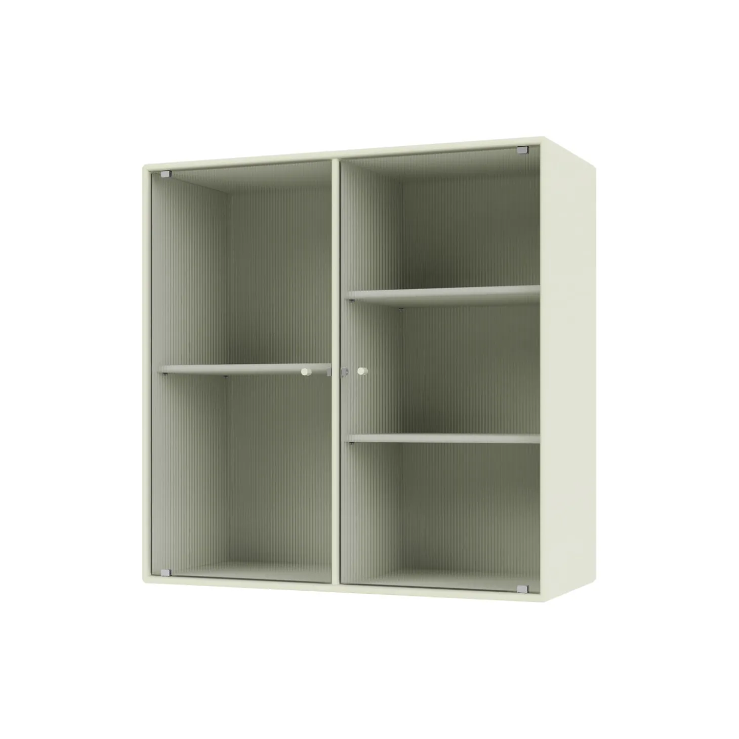 RIPPLE II er et vitrineskab med 2 låger i riflet glas. Skabet fås med ophængsbeslag, sokkel og ben. Det kan bruges som et overskab i køkkenet eller som et udstillingsmøbel i stuen eller spisestuen. Skabet har 3 flytbare hylder med bærere, som gør det lettere at arrangere og omarrangere hylderne efter behov.