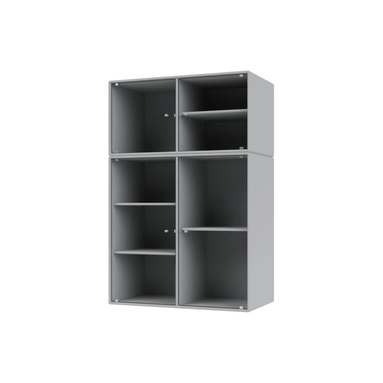 RIPPLE III er et mellemstort vitrineskab med 4 låger i riflet glas. Det fås med ben, sokkel og ophængsbeslag til montering på væg. Skabet kan bruges som skænk i stuen eller til udstilling af service i køkkenet eller spisestuen. Skabet har 4 flytbare hylder med bærere, som gør det lettere at arrangere og omarrangere hylder efter behov.
