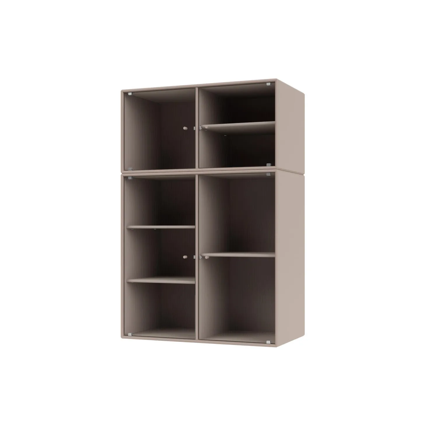RIPPLE III er et mellemstort vitrineskab med 4 låger i riflet glas. Det fås med ben, sokkel og ophængsbeslag til montering på væg. Skabet kan bruges som skænk i stuen eller til udstilling af service i køkkenet eller spisestuen. Skabet har 4 flytbare hylder med bærere, som gør det lettere at arrangere og omarrangere hylder efter behov.