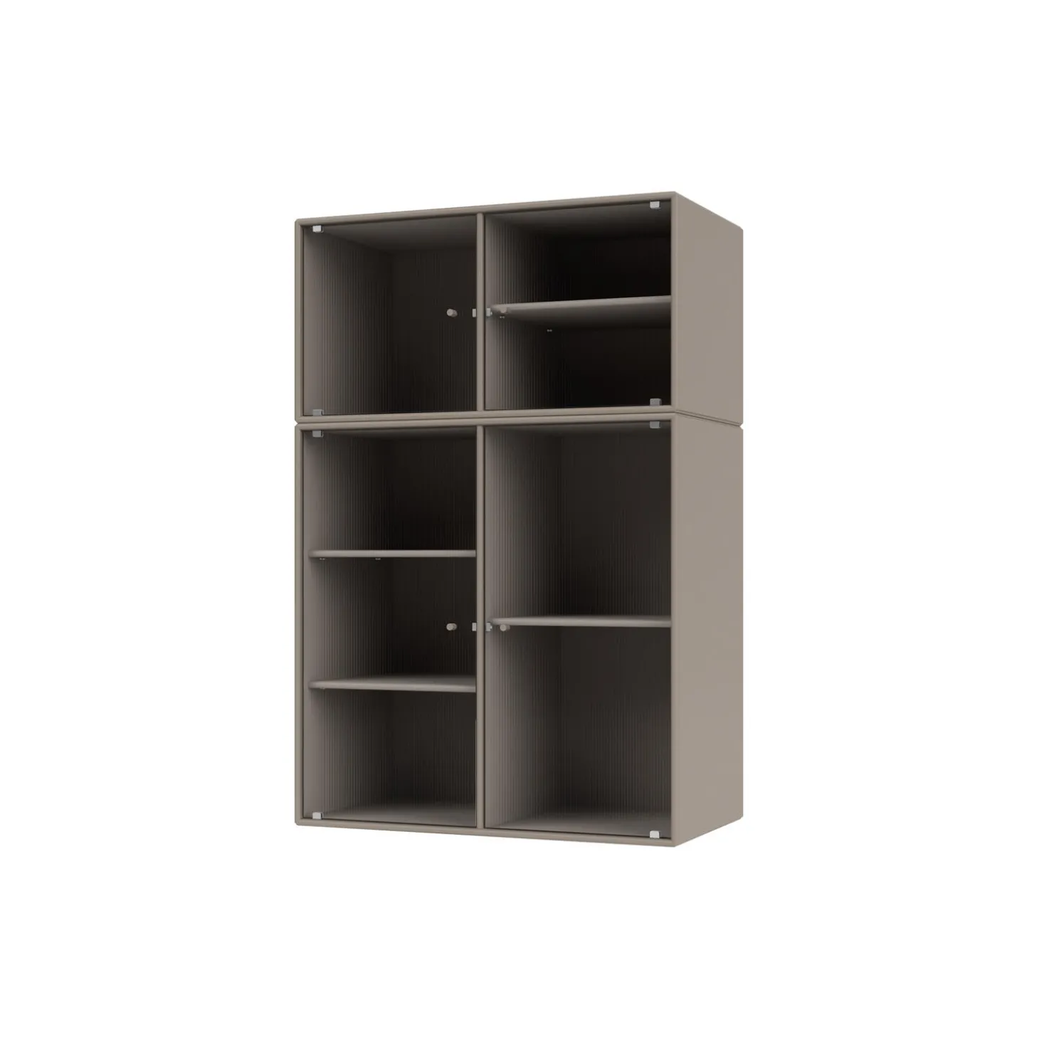 RIPPLE III er et mellemstort vitrineskab med 4 låger i riflet glas. Det fås med ben, sokkel og ophængsbeslag til montering på væg. Skabet kan bruges som skænk i stuen eller til udstilling af service i køkkenet eller spisestuen. Skabet har 4 flytbare hylder med bærere, som gør det lettere at arrangere og omarrangere hylder efter behov.