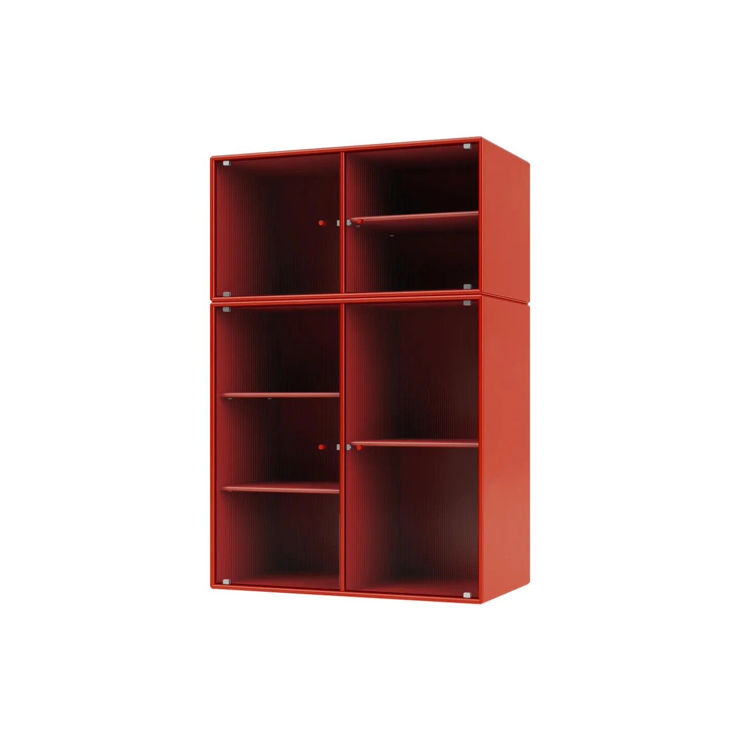 RIPPLE III er et mellemstort vitrineskab med 4 låger i riflet glas. Det fås med ben, sokkel og ophængsbeslag til montering på væg. Skabet kan bruges som skænk i stuen eller til udstilling af service i køkkenet eller spisestuen. Skabet har 4 flytbare hylder med bærere, som gør det lettere at arrangere og omarrangere hylder efter behov.