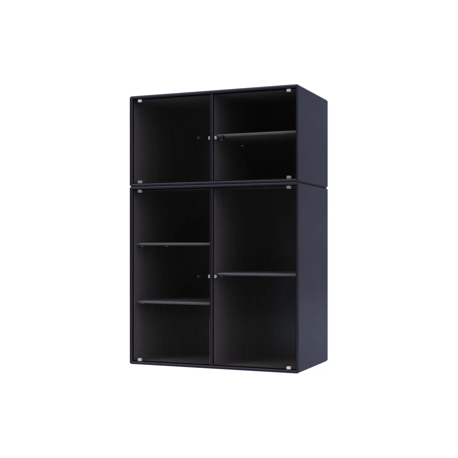 RIPPLE III er et mellemstort vitrineskab med 4 låger i riflet glas. Det fås med ben, sokkel og ophængsbeslag til montering på væg. Skabet kan bruges som skænk i stuen eller til udstilling af service i køkkenet eller spisestuen. Skabet har 4 flytbare hylder med bærere, som gør det lettere at arrangere og omarrangere hylder efter behov.