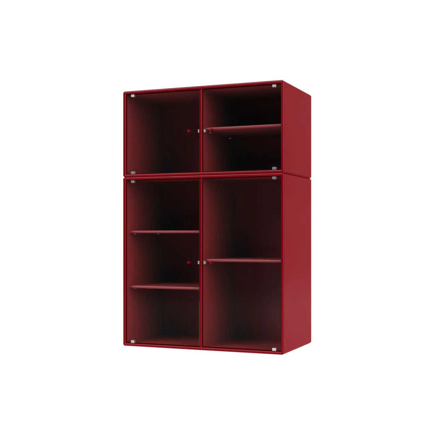 RIPPLE III er et mellemstort vitrineskab med 4 låger i riflet glas. Det fås med ben, sokkel og ophængsbeslag til montering på væg. Skabet kan bruges som skænk i stuen eller til udstilling af service i køkkenet eller spisestuen. Skabet har 4 flytbare hylder med bærere, som gør det lettere at arrangere og omarrangere hylder efter behov.