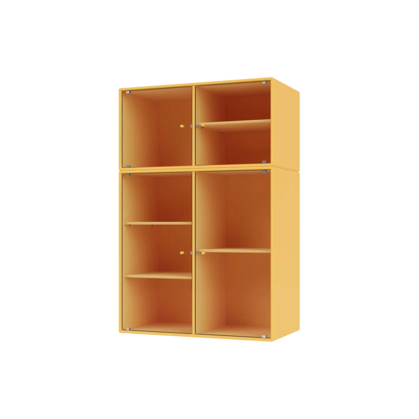 RIPPLE III er et mellemstort vitrineskab med 4 låger i riflet glas. Det fås med ben, sokkel og ophængsbeslag til montering på væg. Skabet kan bruges som skænk i stuen eller til udstilling af service i køkkenet eller spisestuen. Skabet har 4 flytbare hylder med bærere, som gør det lettere at arrangere og omarrangere hylder efter behov.