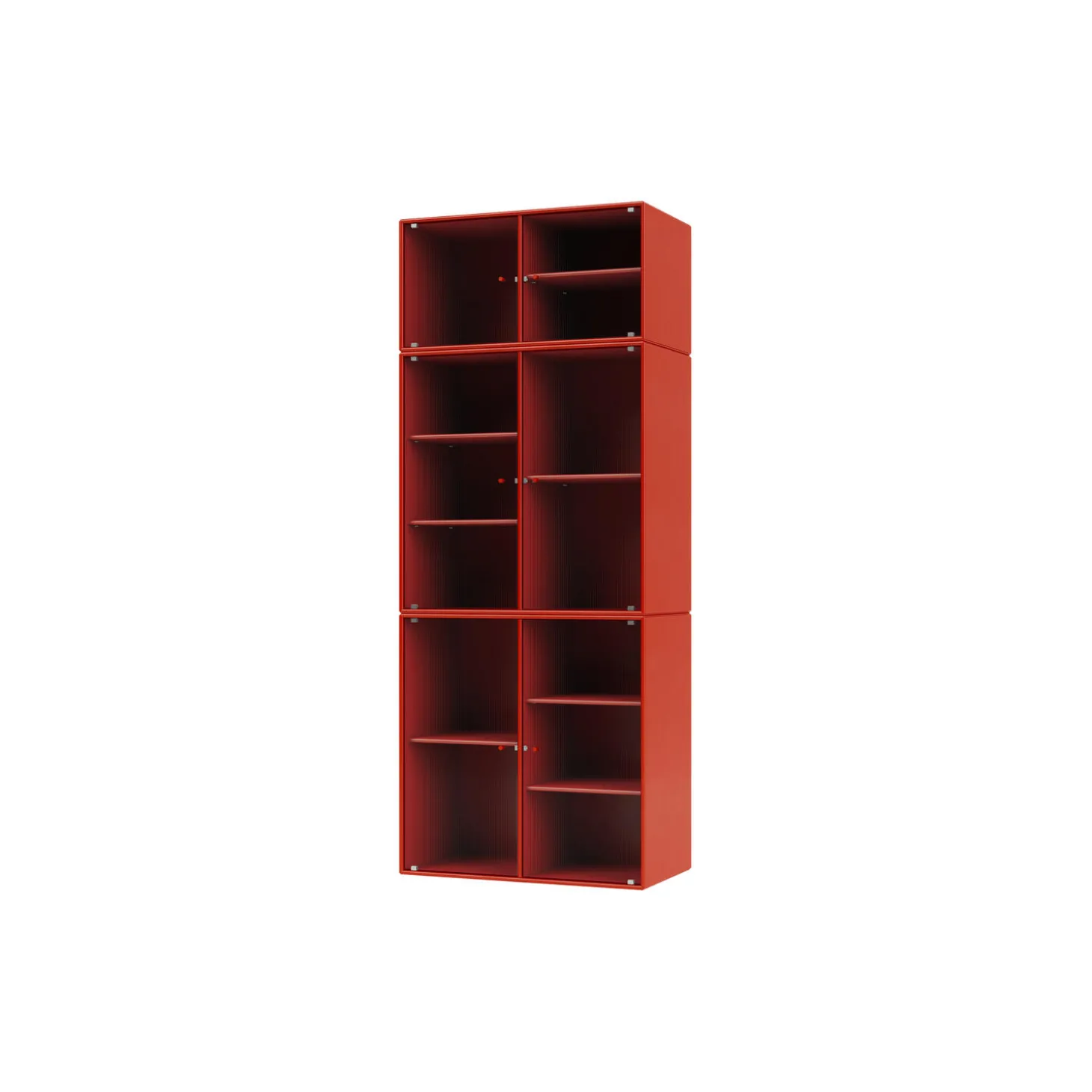 RIPPLE IV er et stort vitrineskab med 6 låger i riflet glas. Skabet er ideelt til opbevaring af service i spisestuen eller køkkenet. Det kan også rumme højere genstande som vaser. Skabet har 7 flytbare hylder med bærere, som gør det lettere at arrangere og omarrangere hylder efter behov.