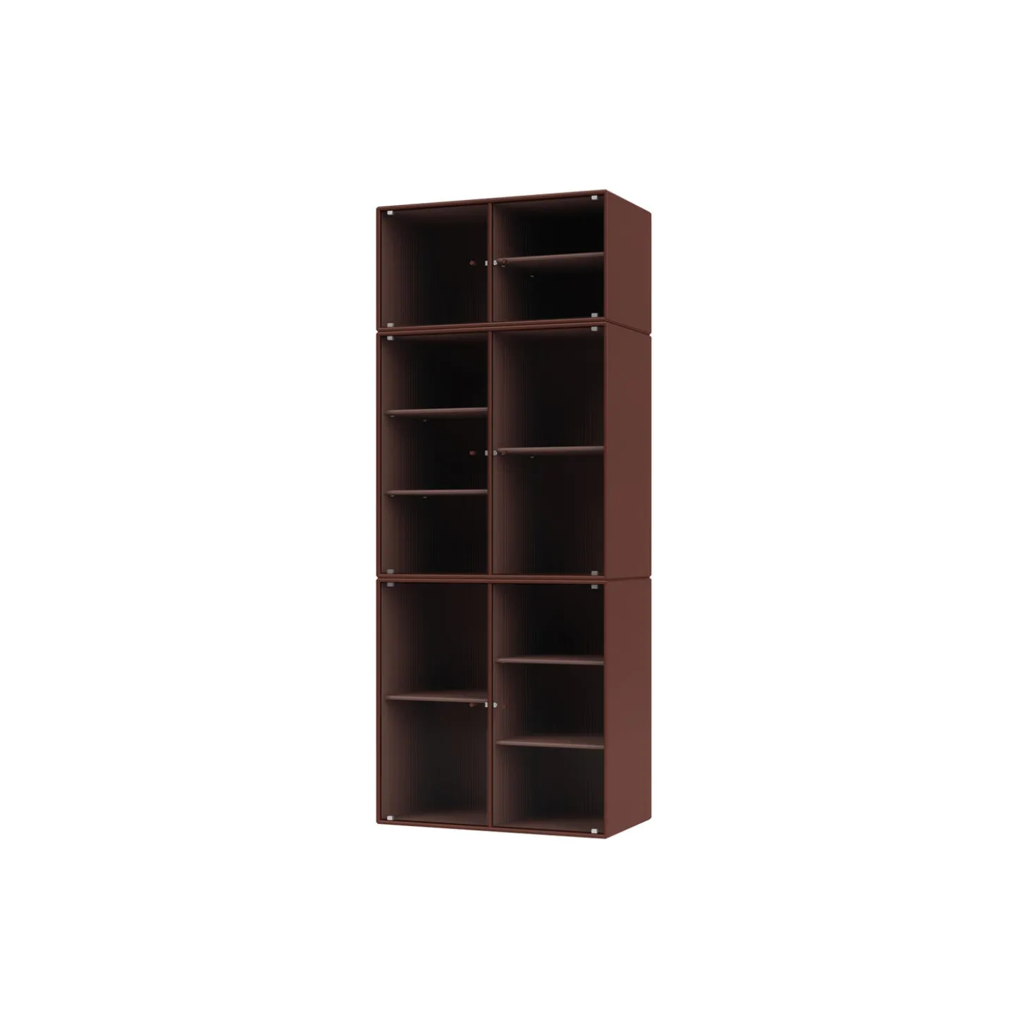 RIPPLE IV er et stort vitrineskab med 6 låger i riflet glas. Skabet er ideelt til opbevaring af service i spisestuen eller køkkenet. Det kan også rumme højere genstande som vaser. Skabet har 7 flytbare hylder med bærere, som gør det lettere at arrangere og omarrangere hylder efter behov.