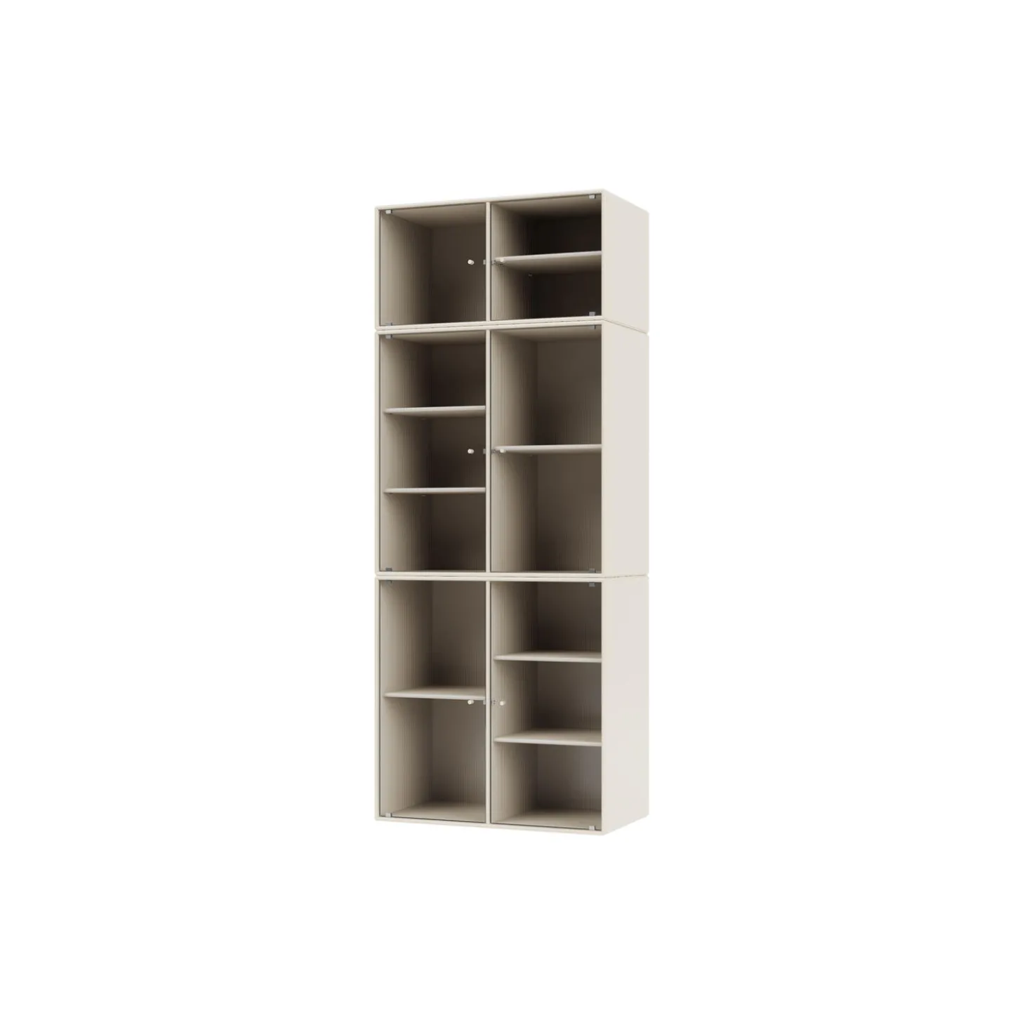 RIPPLE IV er et stort vitrineskab med 6 låger i riflet glas. Skabet er ideelt til opbevaring af service i spisestuen eller køkkenet. Det kan også rumme højere genstande som vaser. Skabet har 7 flytbare hylder med bærere, som gør det lettere at arrangere og omarrangere hylder efter behov.