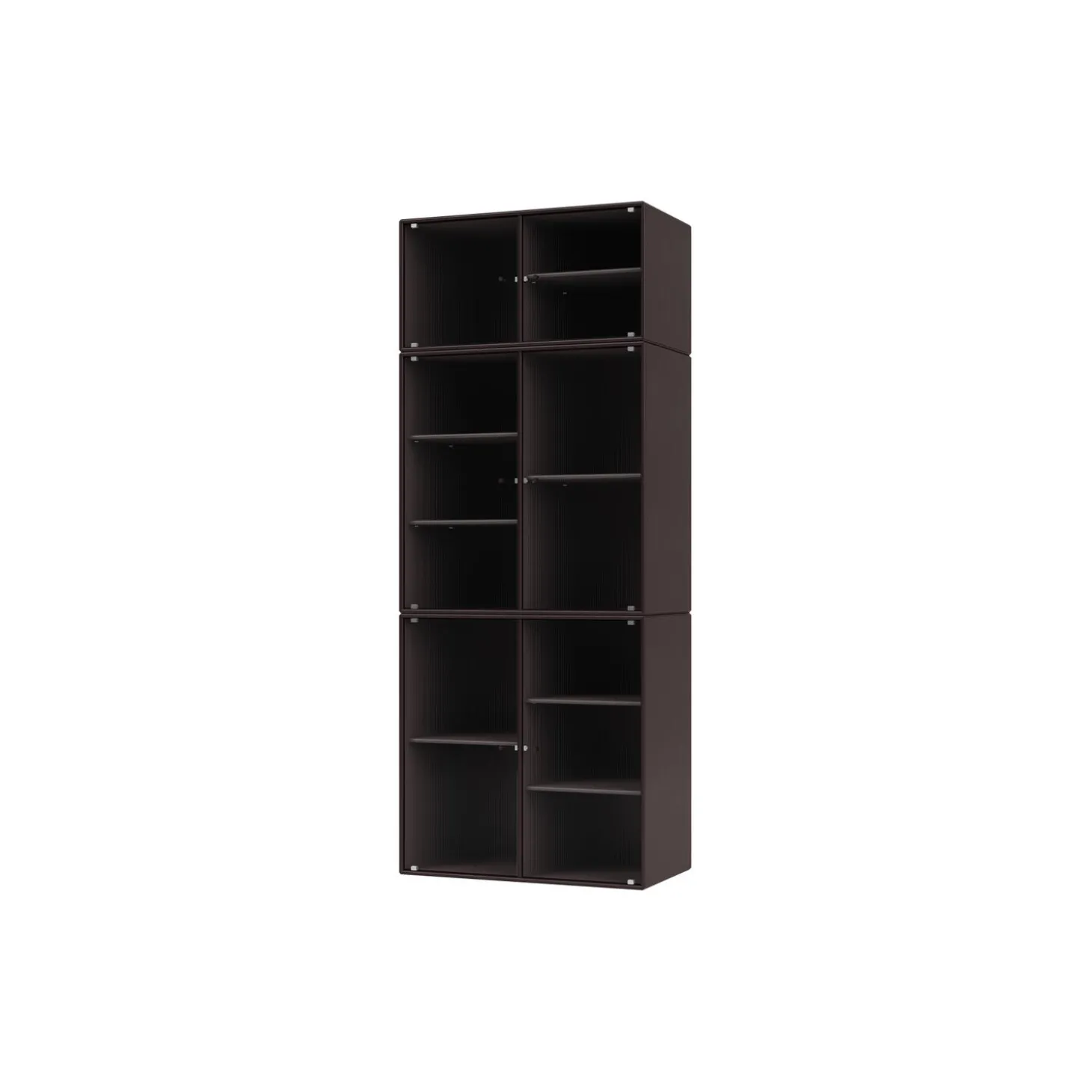 RIPPLE IV er et stort vitrineskab med 6 låger i riflet glas. Skabet er ideelt til opbevaring af service i spisestuen eller køkkenet. Det kan også rumme højere genstande som vaser. Skabet har 7 flytbare hylder med bærere, som gør det lettere at arrangere og omarrangere hylder efter behov.