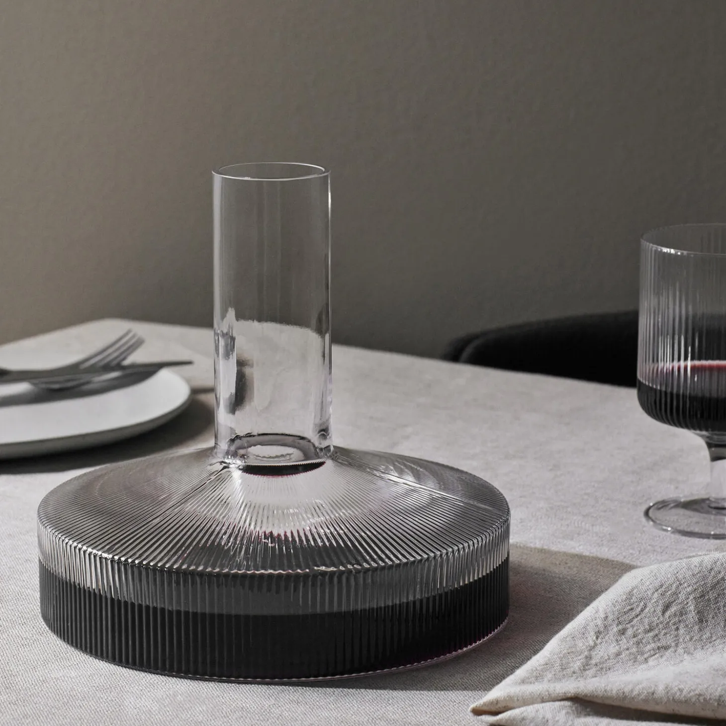 Denne praktiske og smukke vinkaraffel er mundblæst og har et moderne, rillet design. Karaflen er omhyggeligt udformet til at fremme den naturlige iltning af vinen ved at skabe en stor overflade. Designet til dekantering af en liter vin, men kan rumme større mængder, hvis det ønskes.