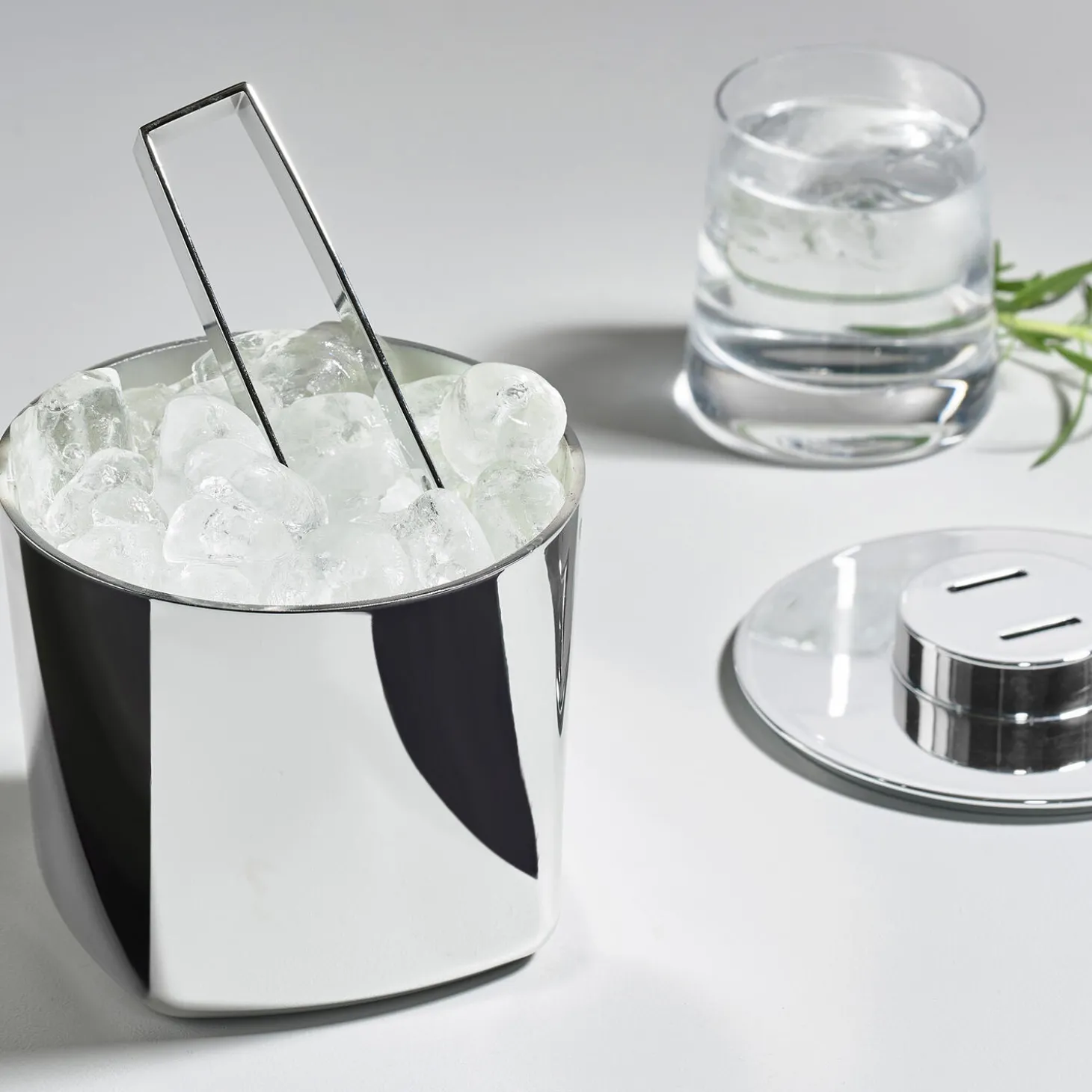 Den danske designduo Mavro//Lefèvre står bag den hyperelegante isspand i rustfrist stål. Som en smeltende isterning glider bundens let kvadratiske facon over i toppens cirkelform. Den afsluttes med et låg, som på genial vis gemmer på en istang.