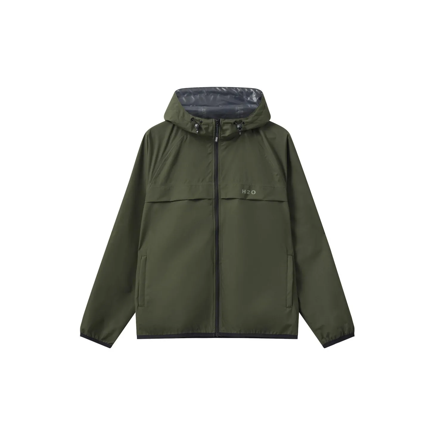 100% recycled polyester, laminated. 3000mm waterproofness, breathability 800g/m2/24hrs. Taped seams. ECO water repellence. Welt pocket with zipper and logo zip puller. Embossed rubber logo print.