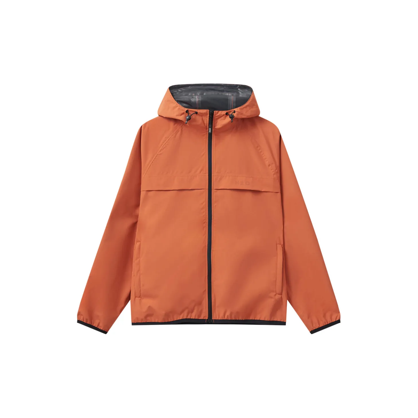 100% recycled polyester, laminated. 3000mm waterproofness, breathability 800g/m2/24hrs. Taped seams. ECO water repellence. Welt pocket with zipper and logo zip puller. Embossed rubber logo print.
