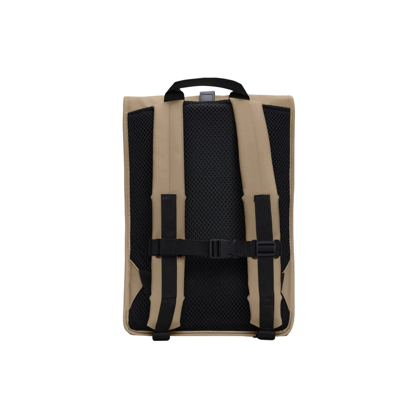 Rolltop Rucksack is a dependable city staple that’s perfect for commutes on bike or foot. Characterized by a rolltop opening and cycle-ready features.Rolltop Rucksack is carefully designed to keep precipitation out when traveling from point A to Z. To protect essentials from rain, fold the rolltop into a tight scroll and secure using the signature carabiner. Open the rucksack to reveal a single main compartment. Exterior features include a side-access laptop pocket and a front pocket with coated zipper. Cycle-ready features include a front D-ring — ideal for holding bike locks — and a buckle-fastened chest strap for a secure ride-proof fit.Rolltop Rucksack is cut from Rains’ signature PU fabric, engineered for carrying strength, durability and a smooth feel.